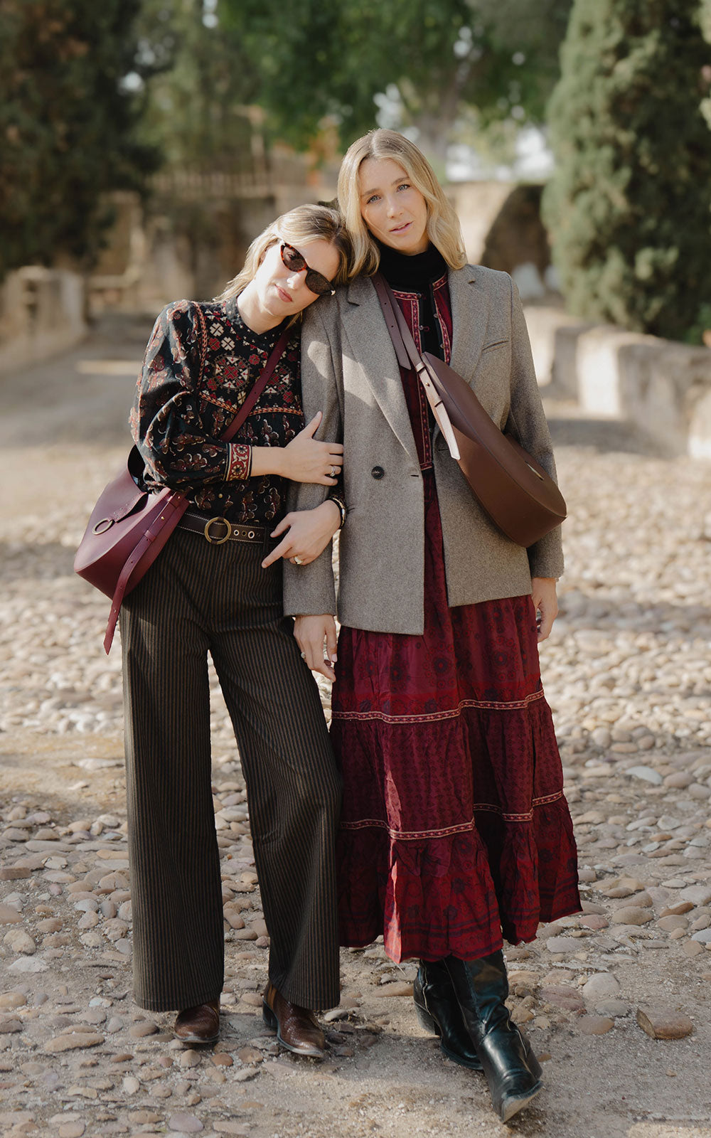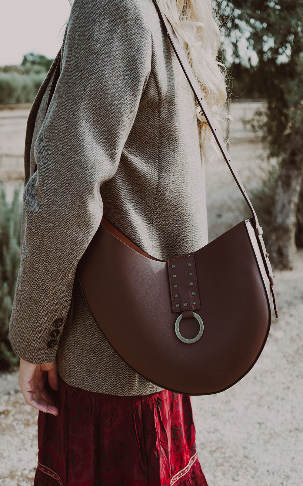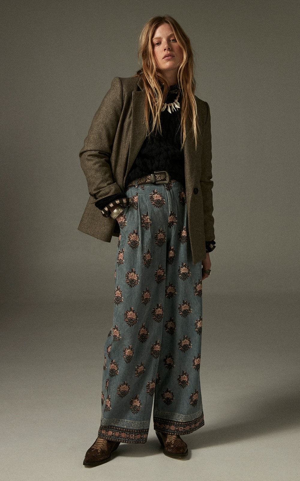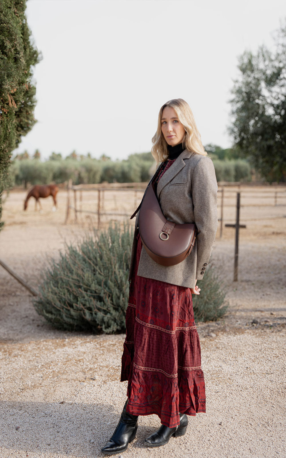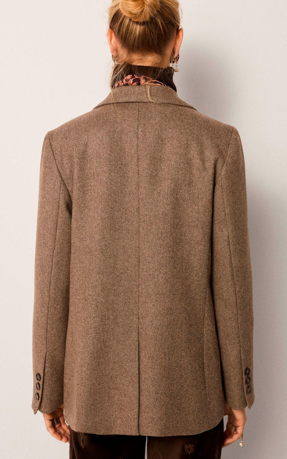 El Blazer Jackie está confeccionado en una mezcla de lana con tejido espiga que aporta textura y profundidad. Su tono nogal, cálido y terroso, refuerza la estructura de una prenda atemporal.