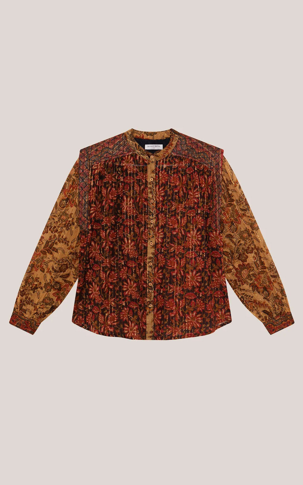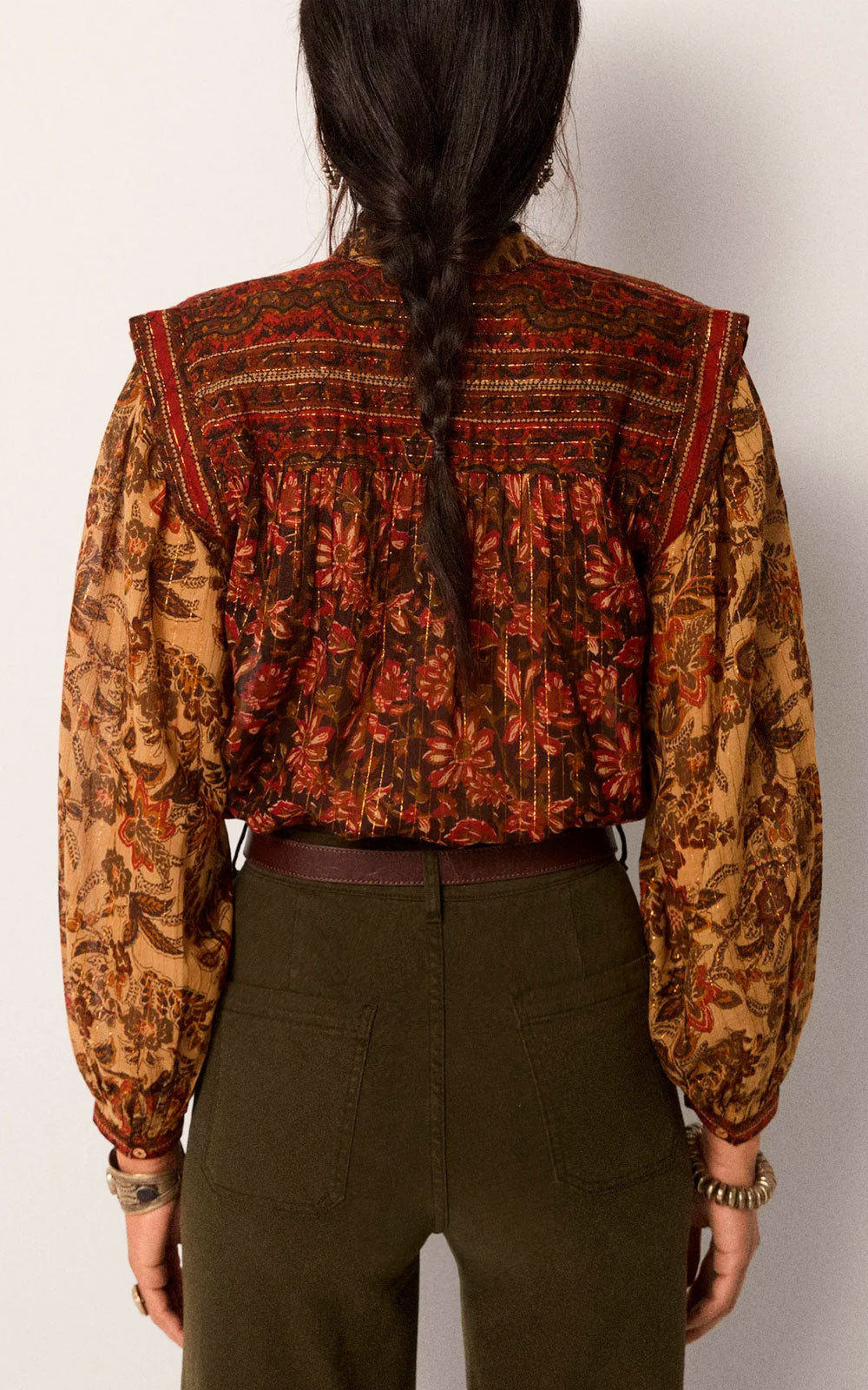 Esta blusa es una celebración de la belleza otoñal en clave bohemia y delicada. Confeccionada en una mezcla ligera de algodón con lurex, tiene un sutil efecto translúcido que atrapa la luz con elegancia. Su estampado floral, realizado a mano en tonos rojizos y ocres, evoca la calidez de la tierra y el susurro de las hojas secas.