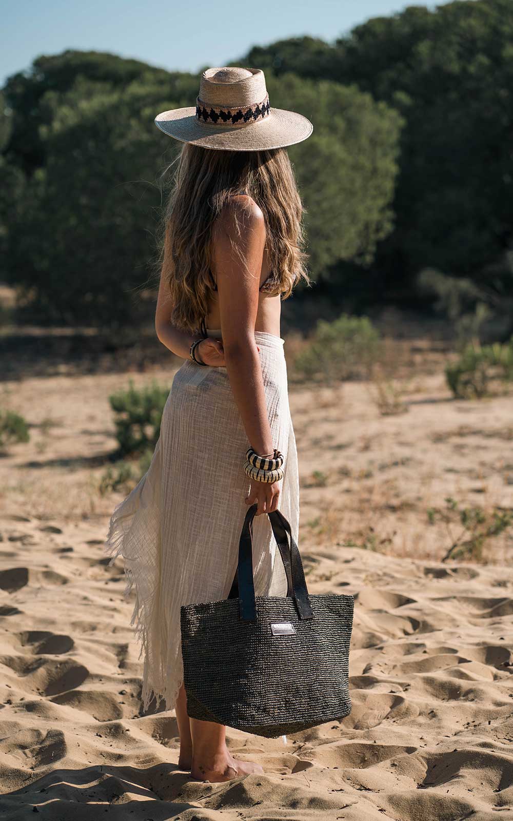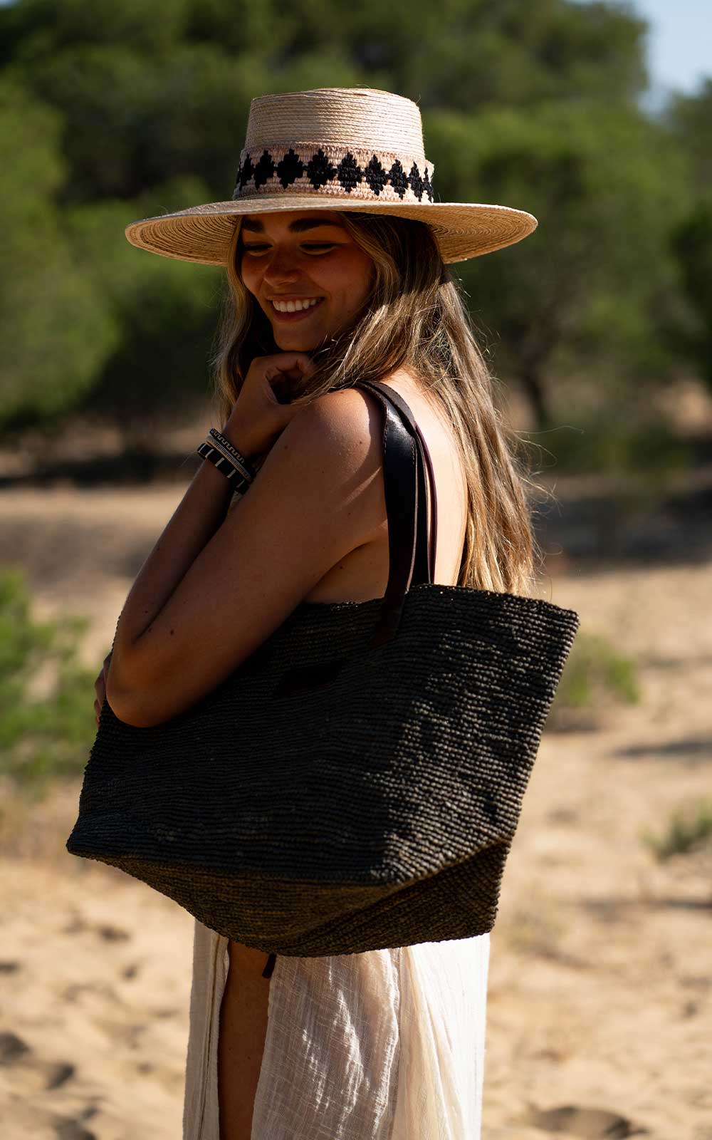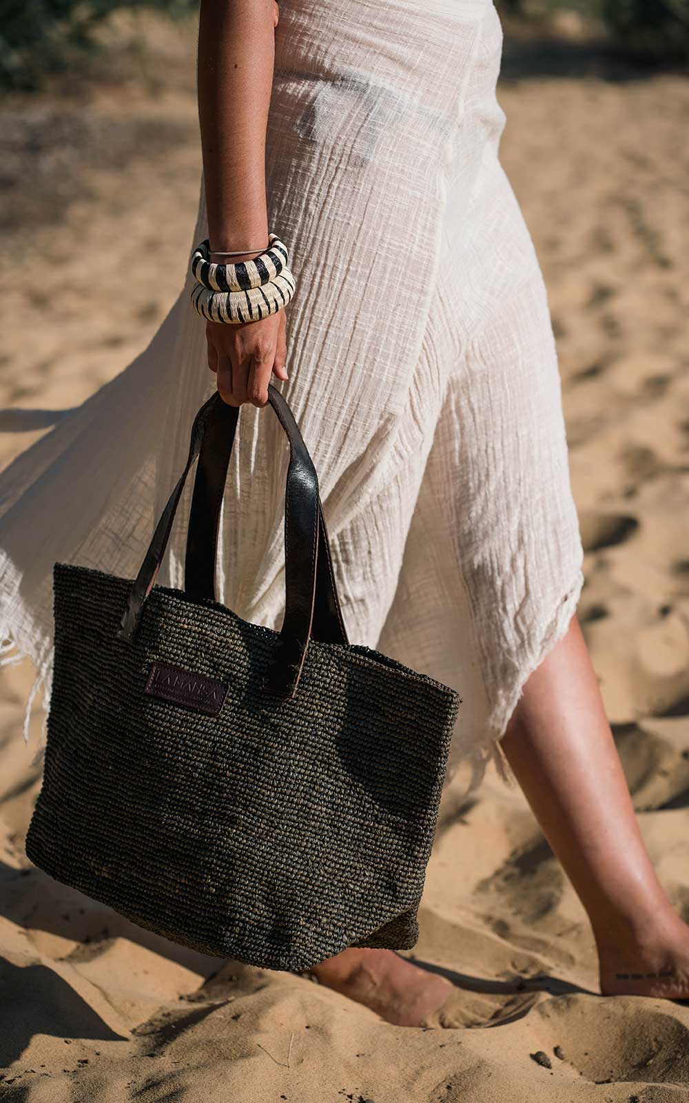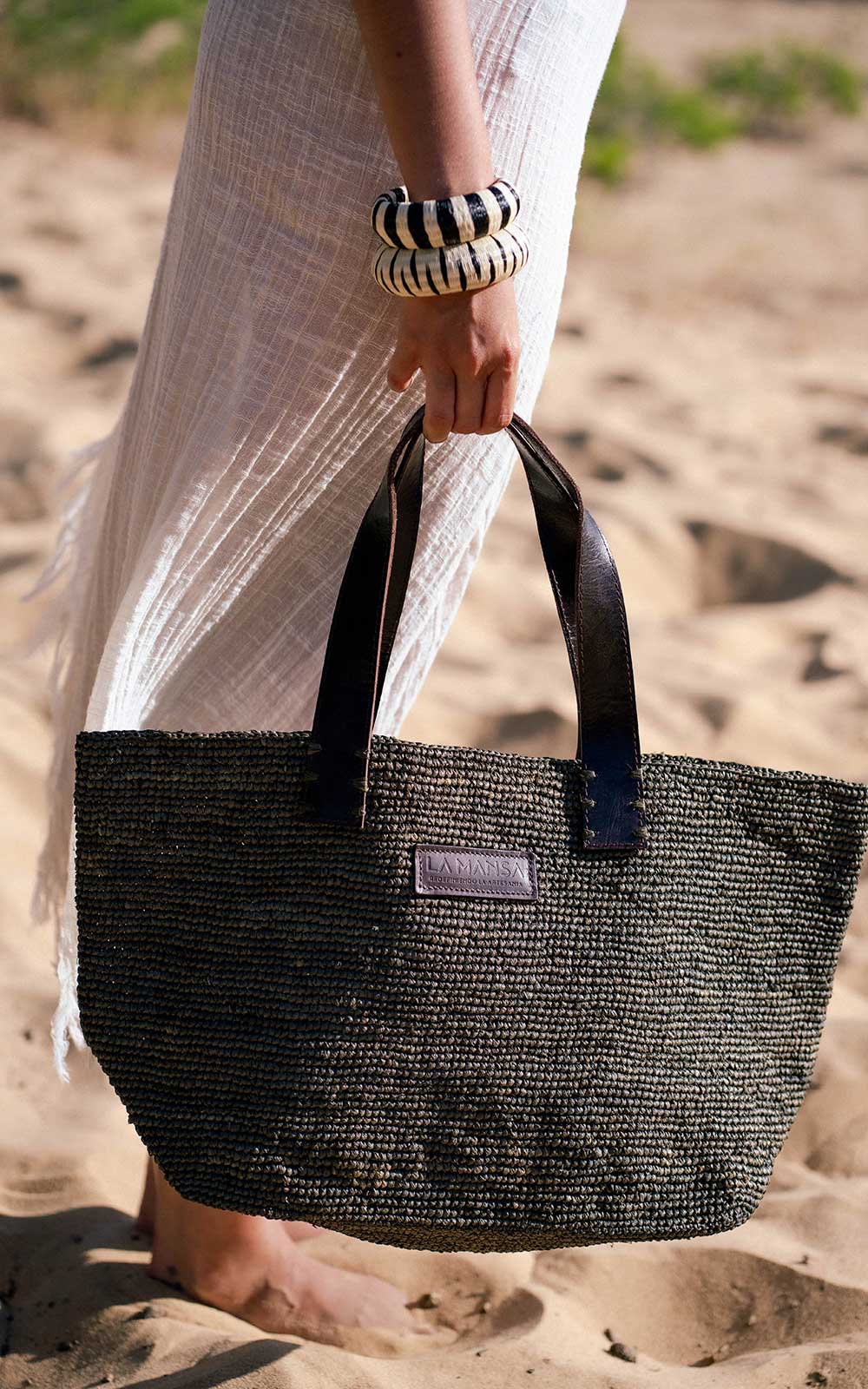 Capazo elaborado con rafia natural por artesanos de Madagascar. Las asas y la estampa son de cuero vegetal. Un capazo alargado para llevarlo a la playa o por la ciudad