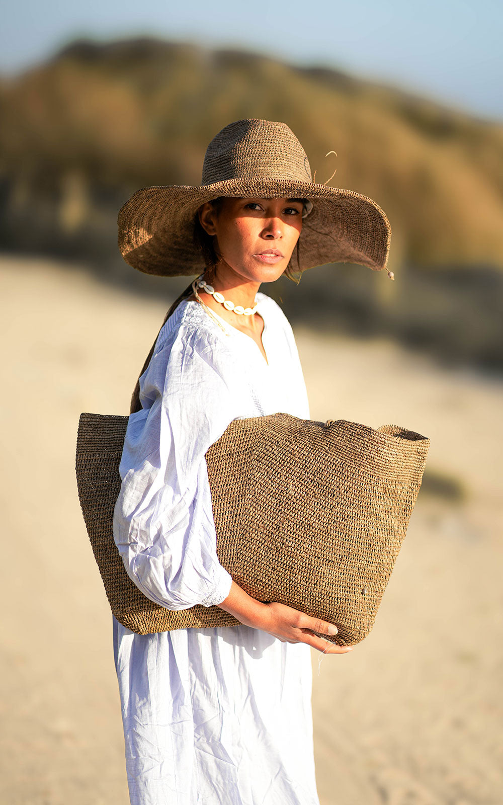 Bolso de tamaño oversize de rafia natural hecho a mano por artesanas de Madagascar. Este bolso tiene gran capacidad para darle un uso diario, llevarlo a la playa y de viaje. El interior es de rafia, no está forrado en tela. Dispone de un bolsillo interior. No tiene cierre.