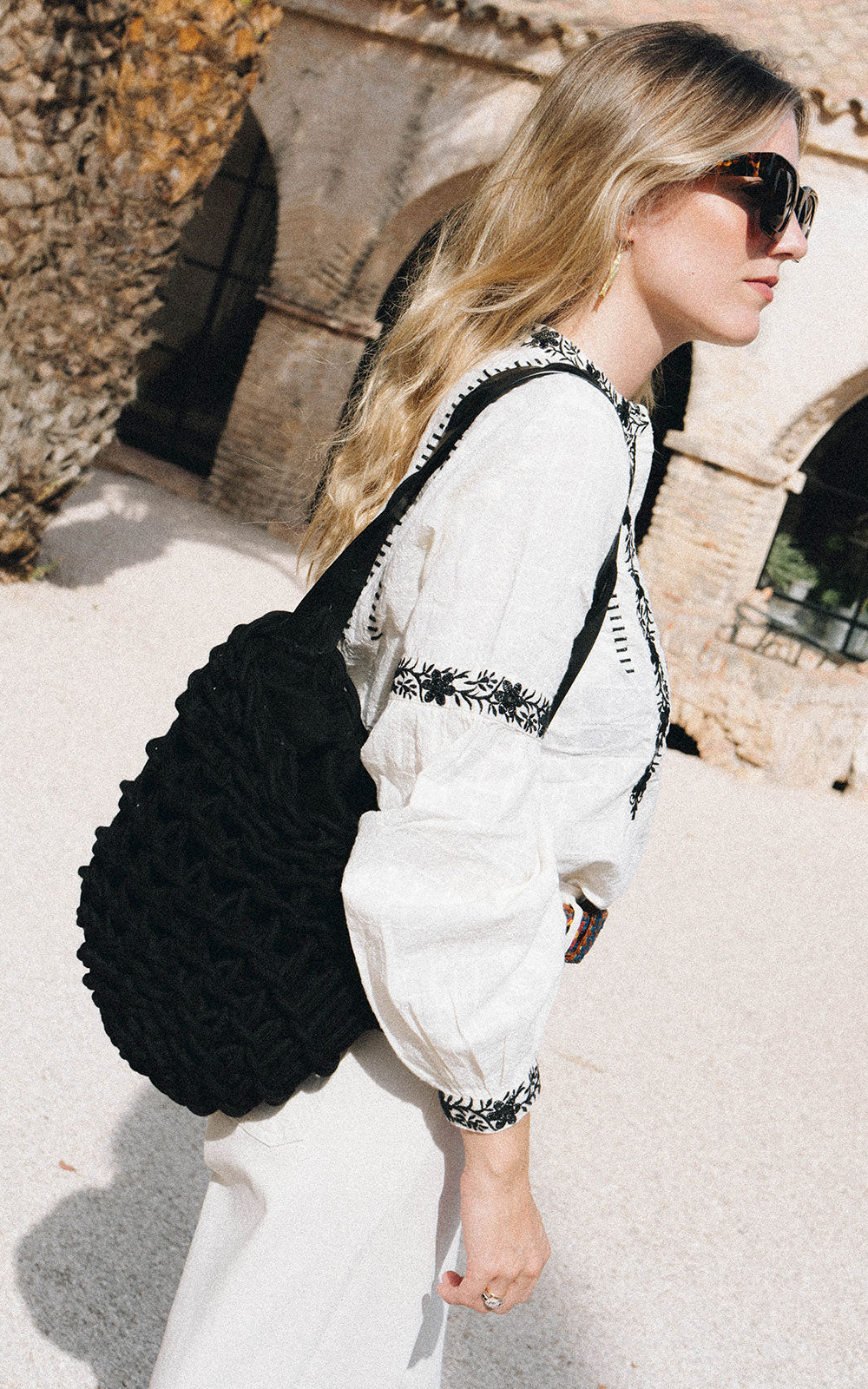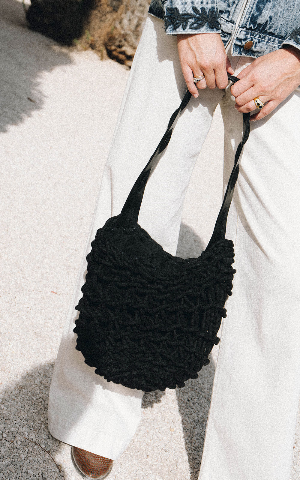 Sofisticado bolso trenzado de con cuerda de algodón natural orgánico con bolsa interior para cierre. El asa es de piel troquelada con cuerda de algodón atravesada que aporta una elegancia única para llevar al hombro.