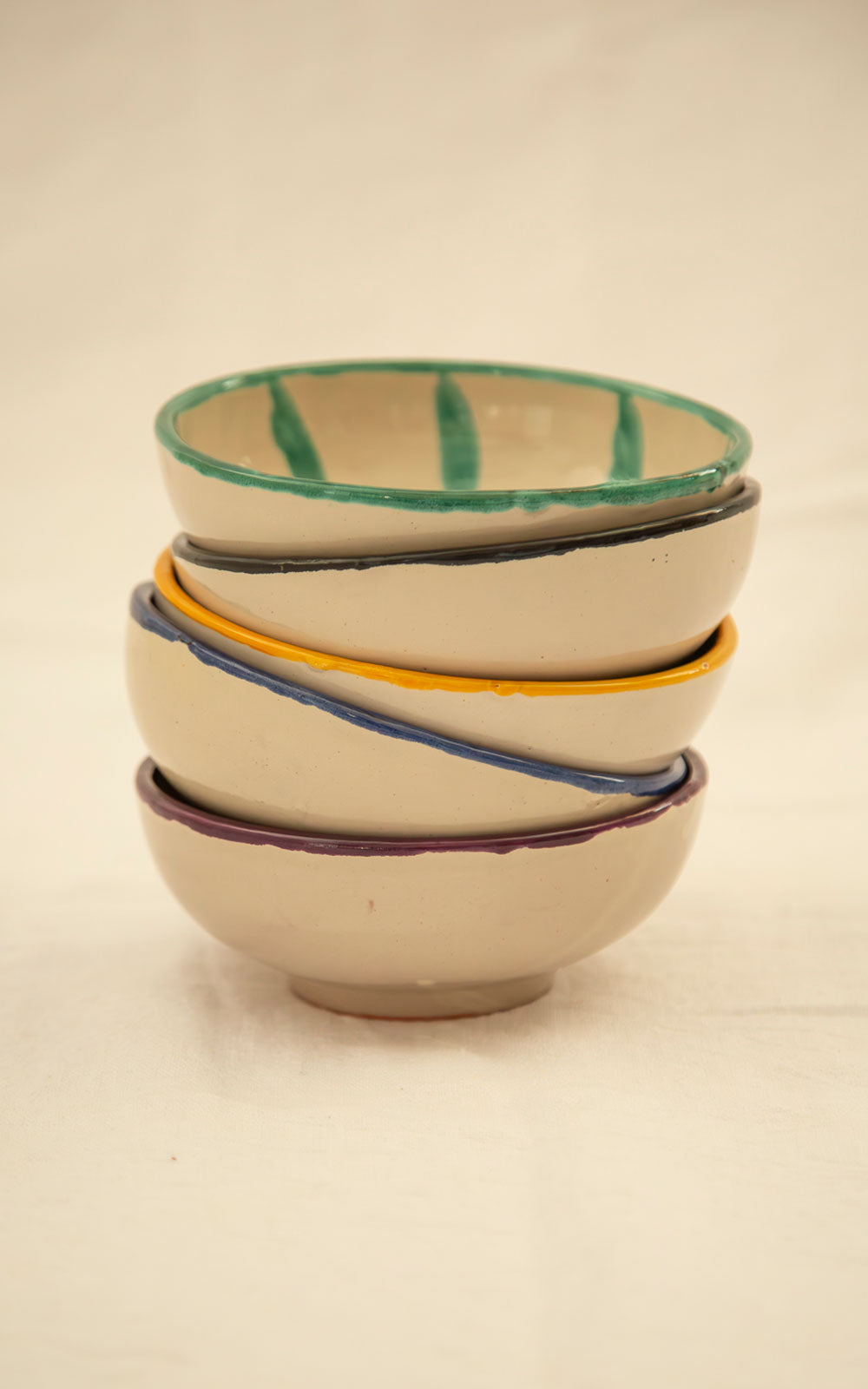 Bowl mediano de cerámica con diseño de rayas pintado a mano en un taller de artesanos de Granada.