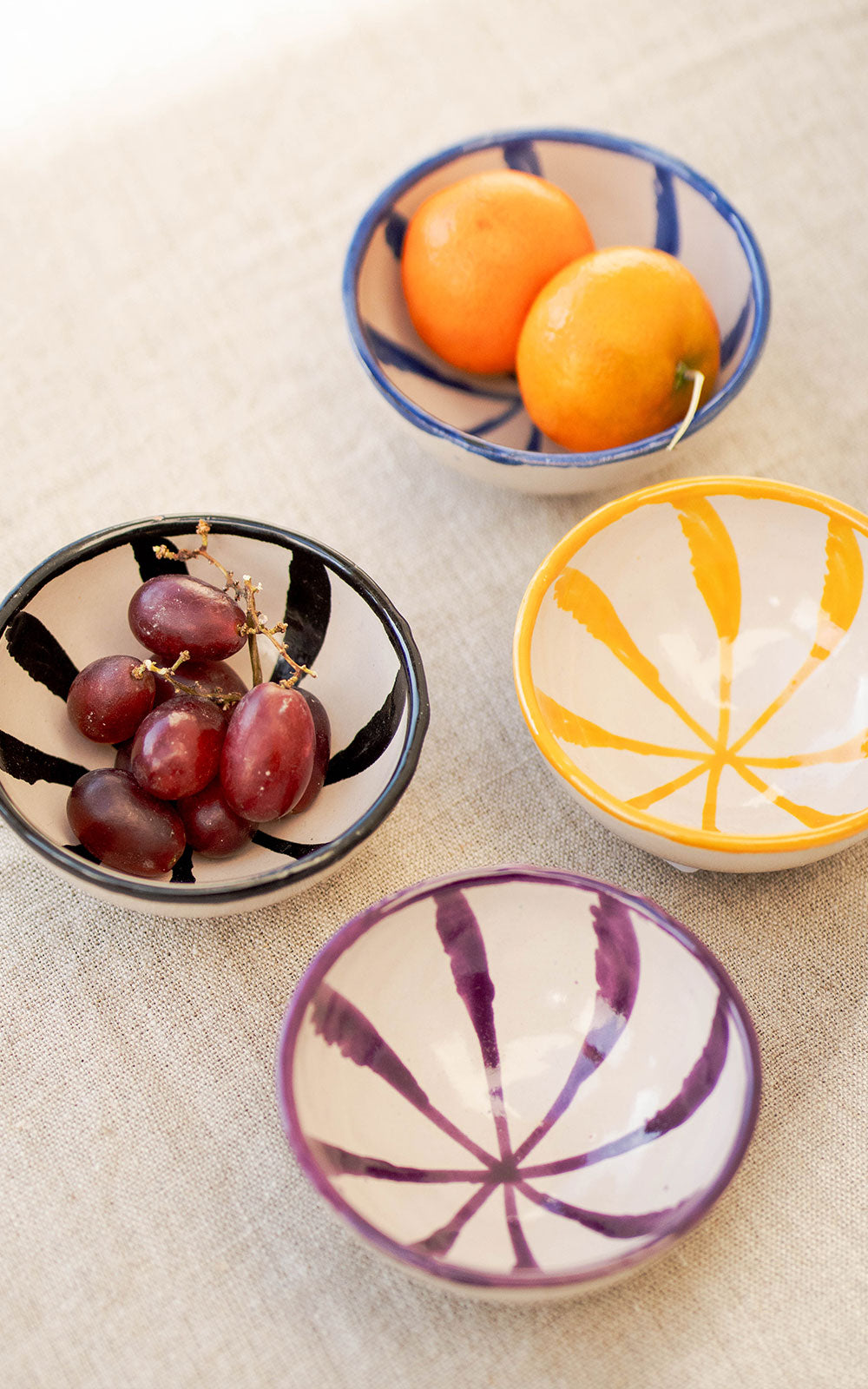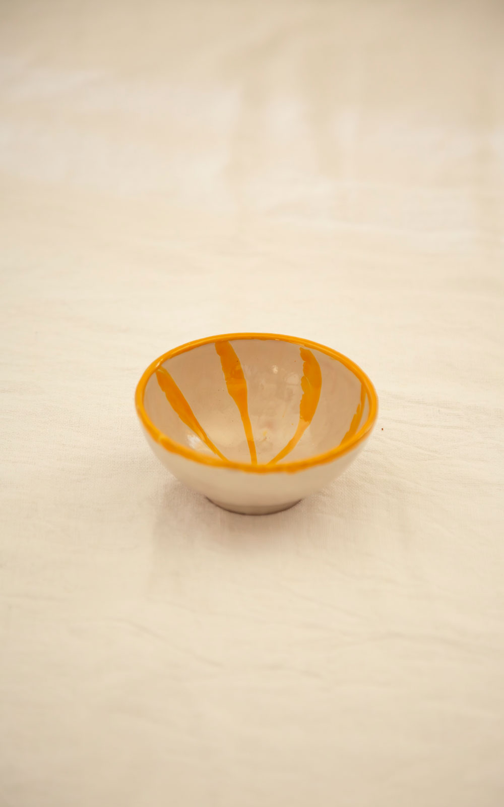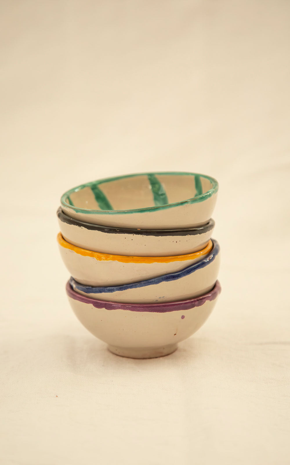 Bowl mini de cerámica con diseño de rayas pintado a mano en un taller de artesanos de Granada.