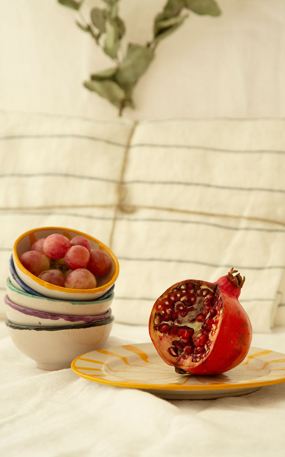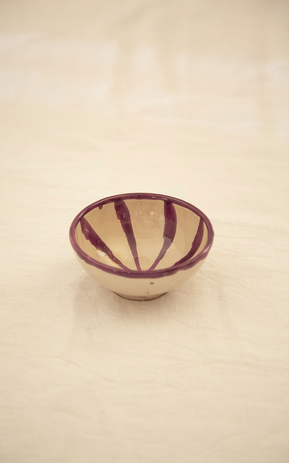 Bowl mini de cerámica con diseño de rayas pintado a mano en un taller de artesanos de Granada.