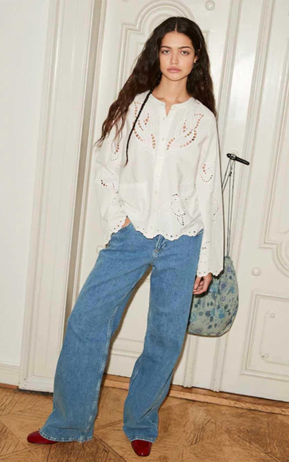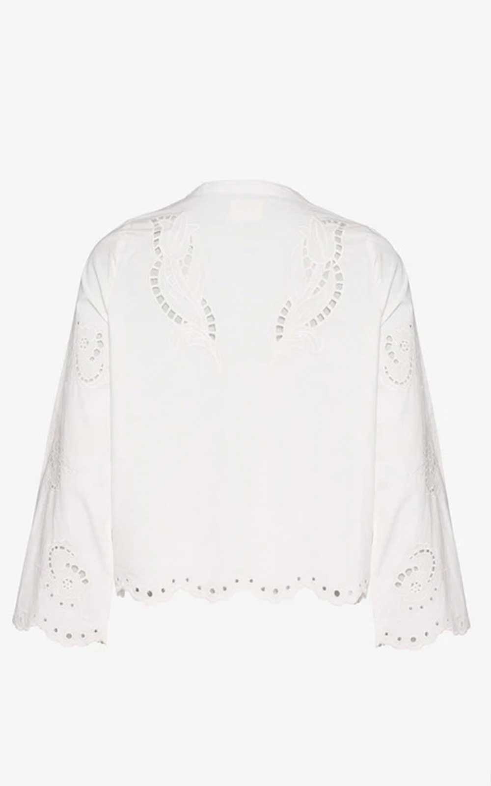 La camisa de algodón orgánico Cecilie es una camisa femenina confeccionada en algodón orgánico. El escote en O y tapeta delantera con botones de nácar. Las mangas son largas y rectas y tiene un bolsillo en la parte delantera izquierda. Esta preciosa camisa está decorada con un precioso bordado calado en la parte delantera, la espalda y las mangas, y el bajo y los bordes de las mangas están decorados con festones bordados. El estilo de la camisa es oversize, son de corte holgado, nota característica de la marca.