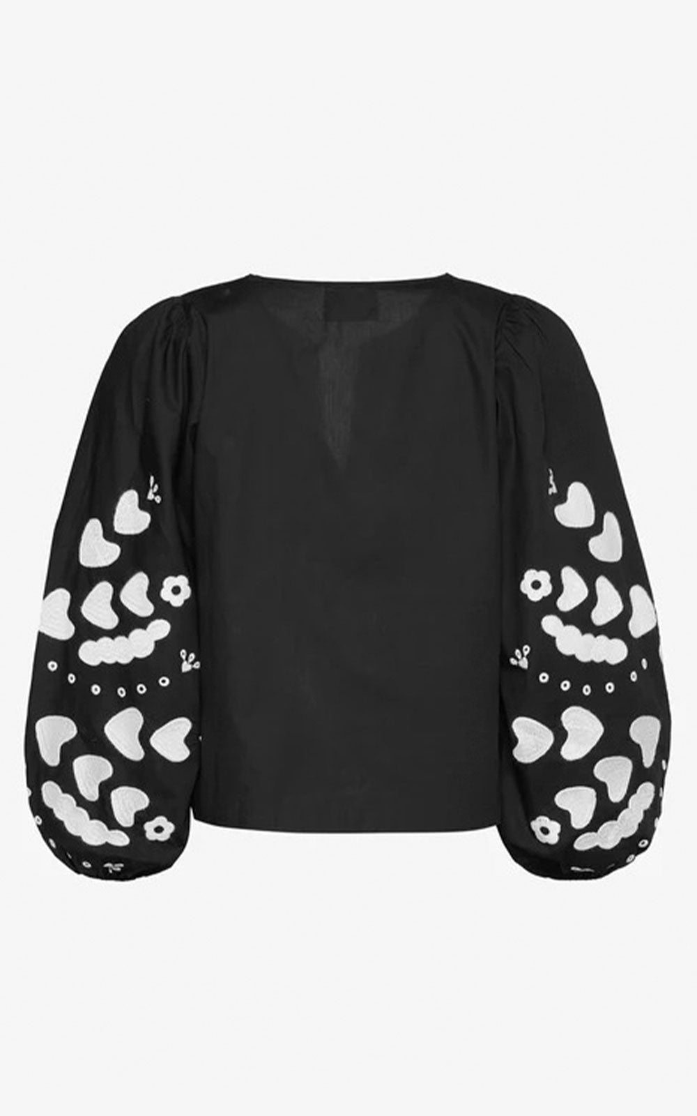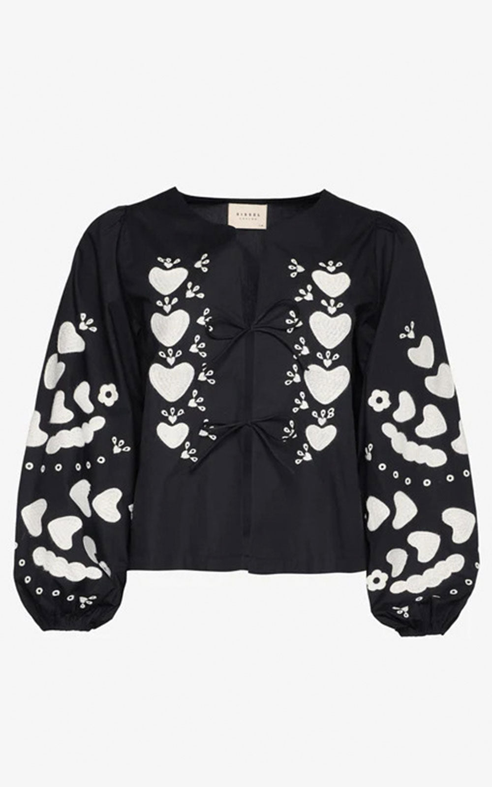 La camisa Elisabeth es un top corto femenino confeccionado en popelín de algodón 100% orgánico. Tiene mangas voluminosas con elástico en el interior de la abertura de la manga. Tiene la parte delantera abierta y se puede atar con dos juegos de finos cordones redondos para pajarita. El top está decorado con nuestro bordado de corazón, delicadamente colocado en el cuerpo por delante y en las mangas. El estilo de la camisa es oversize, son de corte holgado, nota característica de la marca.
