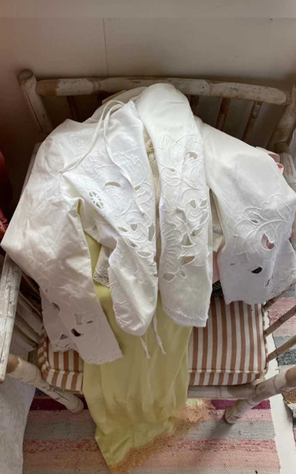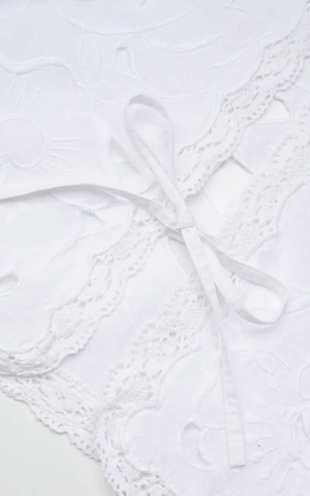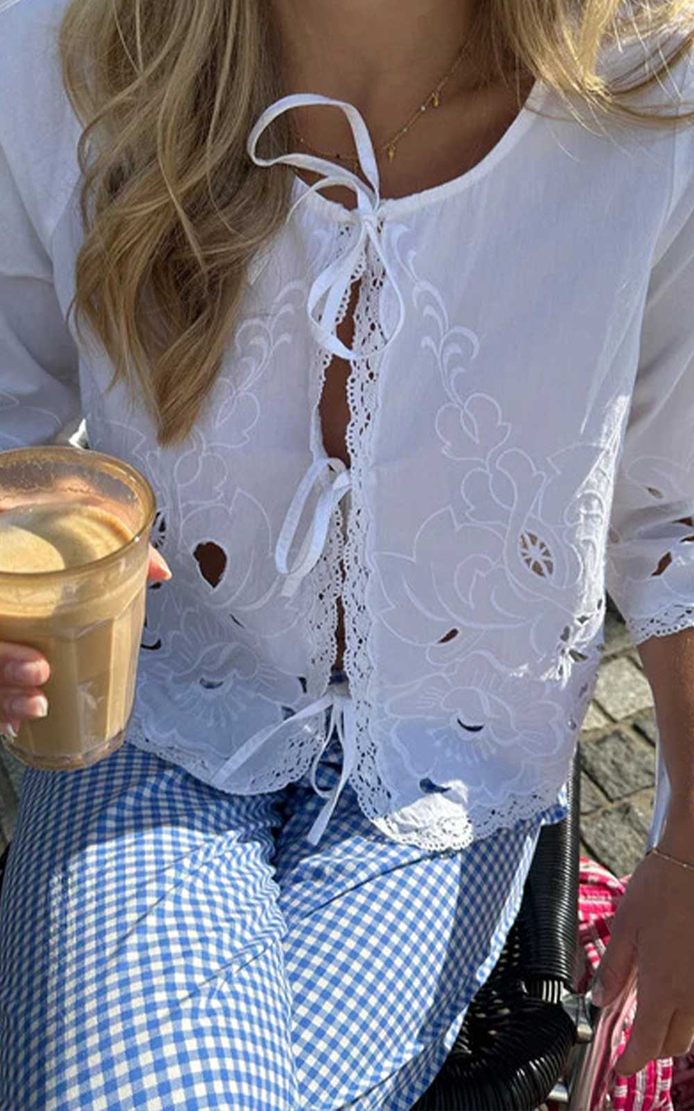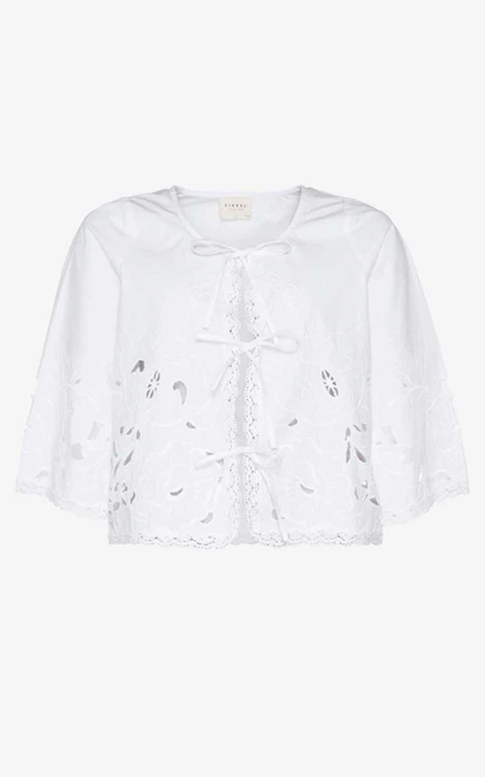 La camisa Yin está confeccionada con bordados y encajes de inspiración vintage. El cierre es mediante el nudo de tres lazos en la parte delantera. Diseño de la firma Sissel Edelbo.