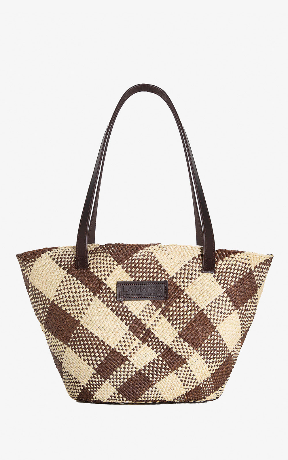 Capazo elaborado con palma de iraca por artesanos de una pequña región de Colombia. Las asas y la estampa son de cuero vegetal. Un capazo alargado para llevarlo a la playa o por la ciudad