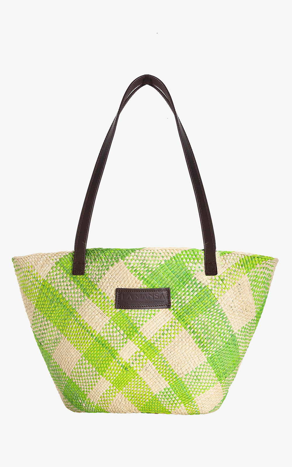 Capazo elaborado con palma de iraca por artesanos de una pequña región de Colombia. Las asas y la estampa son de cuero vegetal. Un capazo alargado para llevarlo a la playa o por la ciudad