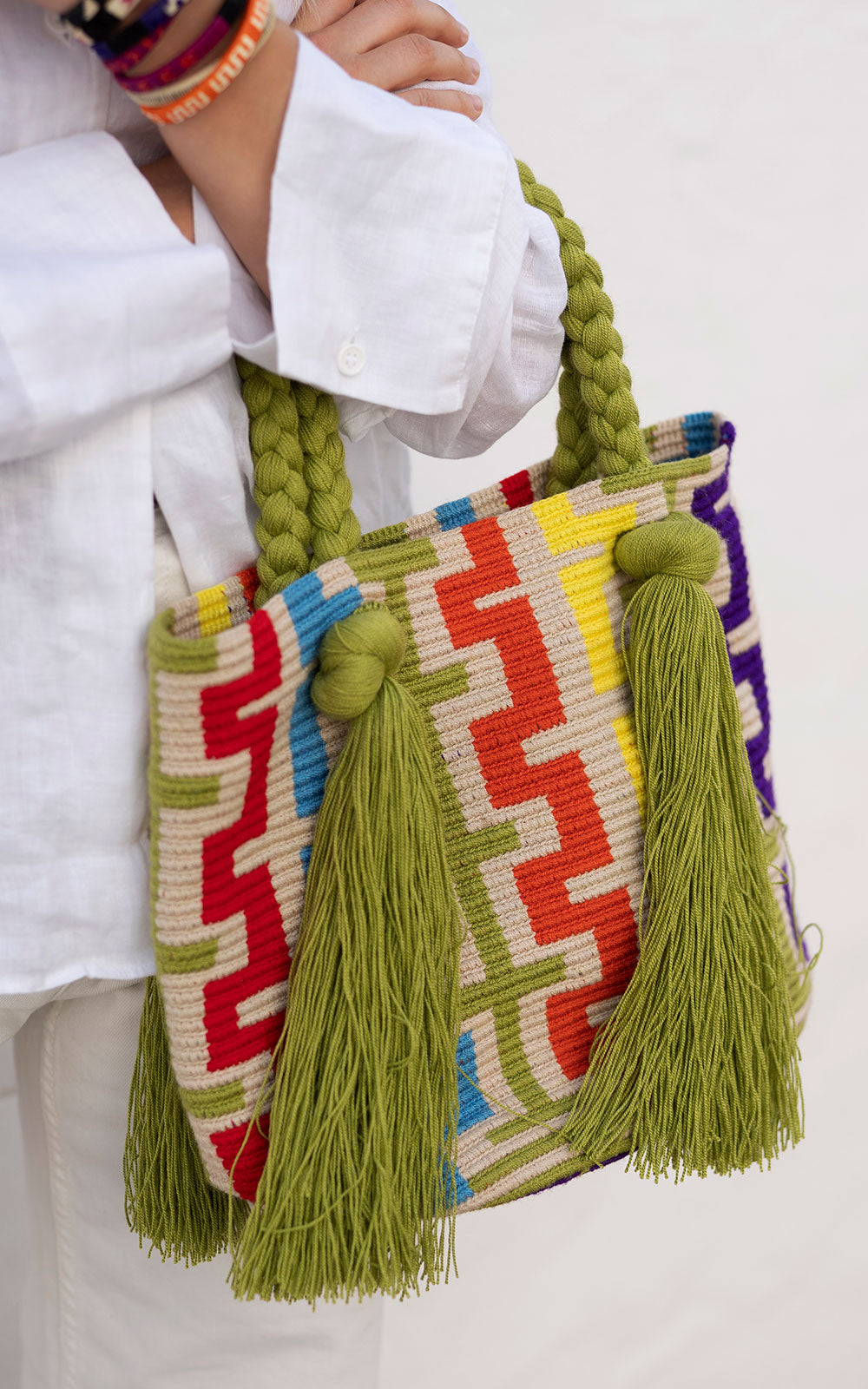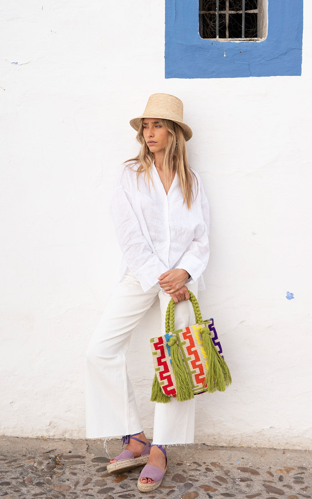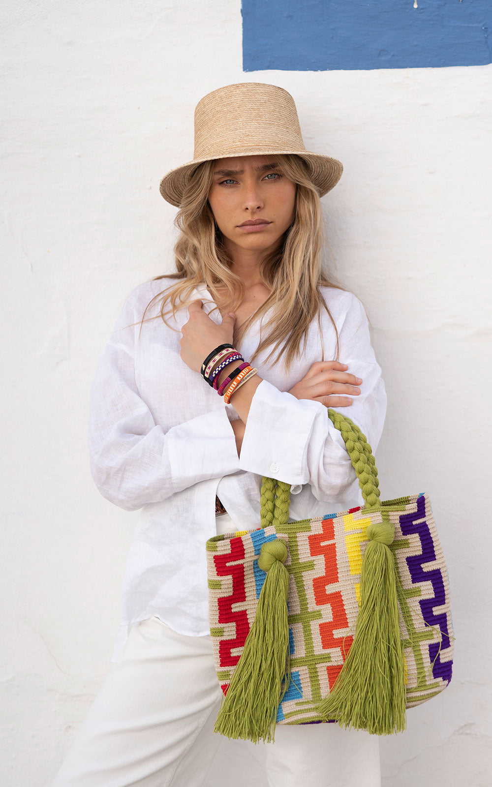 Los diseños son exclusivos de La Mansa que también están presentes en otros modelos como los bolsos wayuu. Este bolso representa una calidad y elegancia exquisita aportando un toque tropical a los looks de cada día. Se puede llevar colgado del hombro y también como bolso de mano.