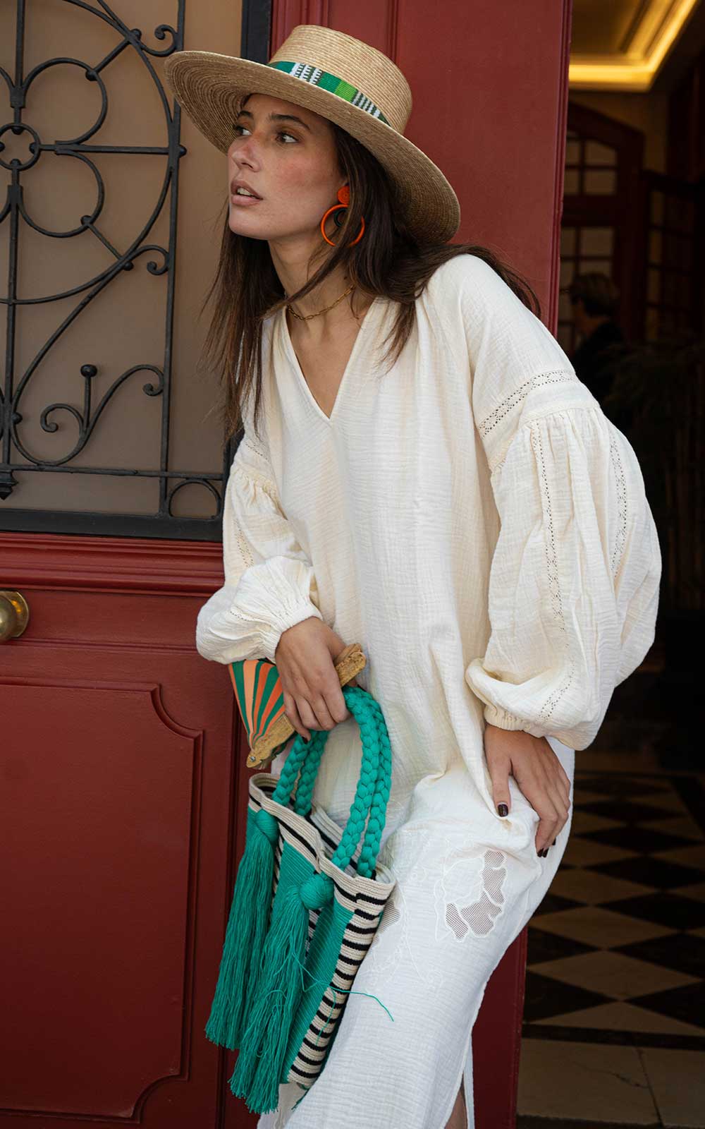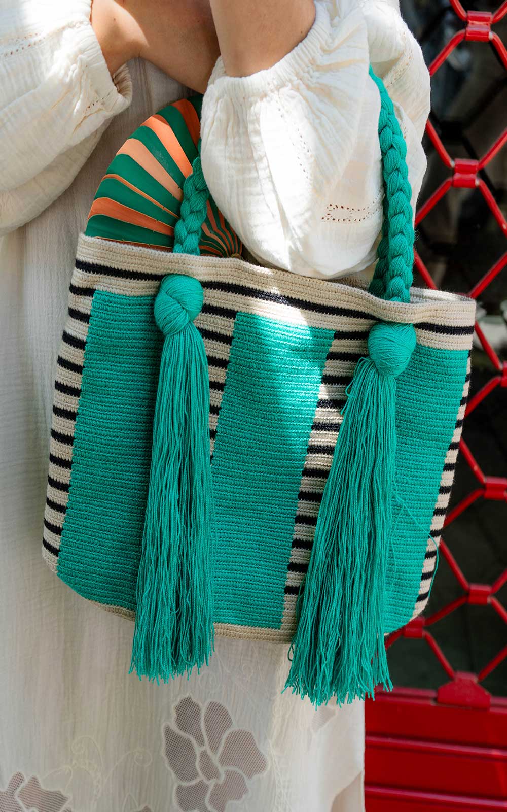 Bolso de algodón elaborado a mano por mujeres de la Guajira mediante la técnica del ganchillo. La caída de los borlones superiores se asemeja al inicio de una cascada de agua. Las asas están formadas por trenzas de hilos unidos entre sí