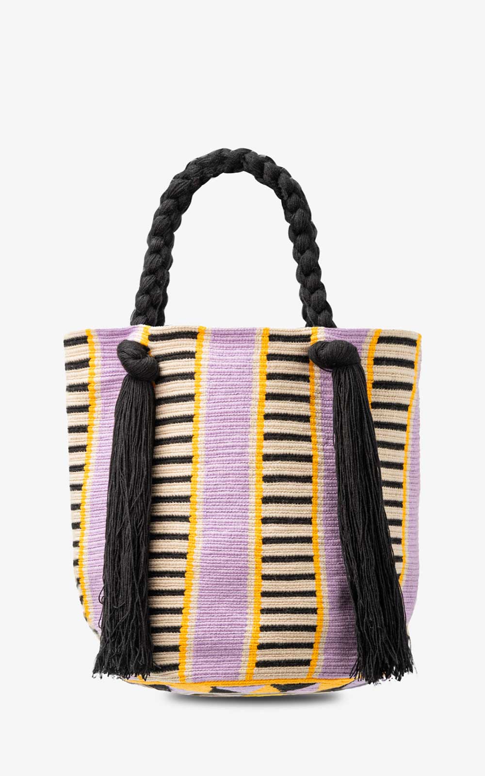 Bolso de algodón elaborado a mano por mujeres de la Guajira mediante la técnica del ganchillo. Es de dimesiones superiores al modelo normal de bolso cascada. Puede llevarse colgado del hombro.