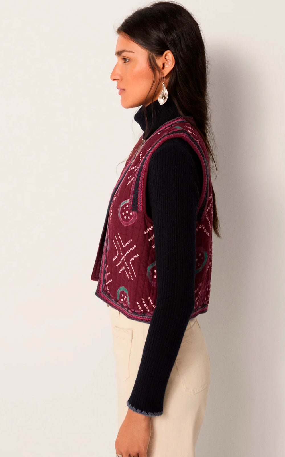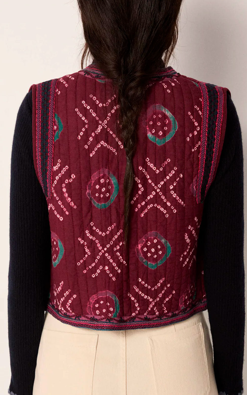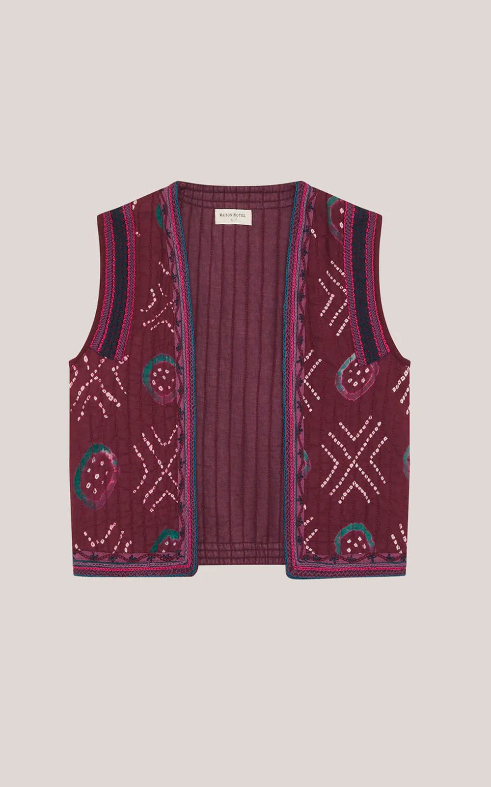 Este chaleco es una celebración del textil artesanal, reinterpretado con sensibilidad contemporánea. Confeccionado en gasa de algodón acolchada, presenta motivos geométricos teñidos a mano que evocan la tradición del ikat: cruces, círculos y puntos con pequeñas irregularidades que revelan el rastro de la mano humana.