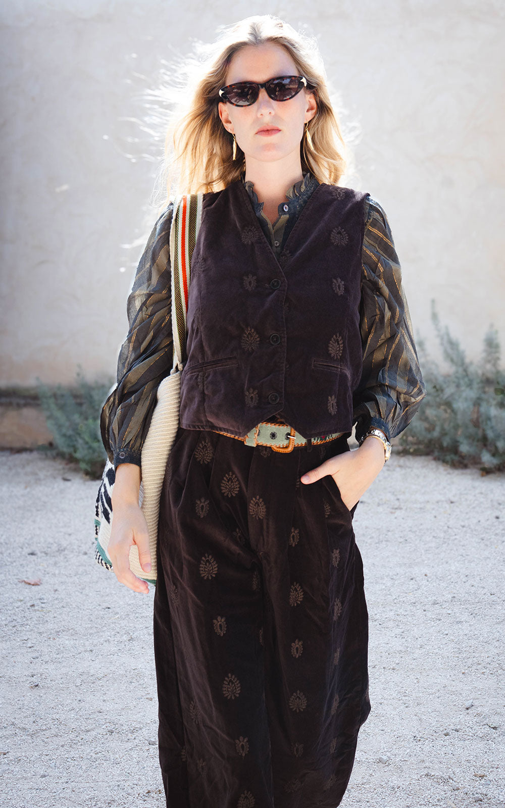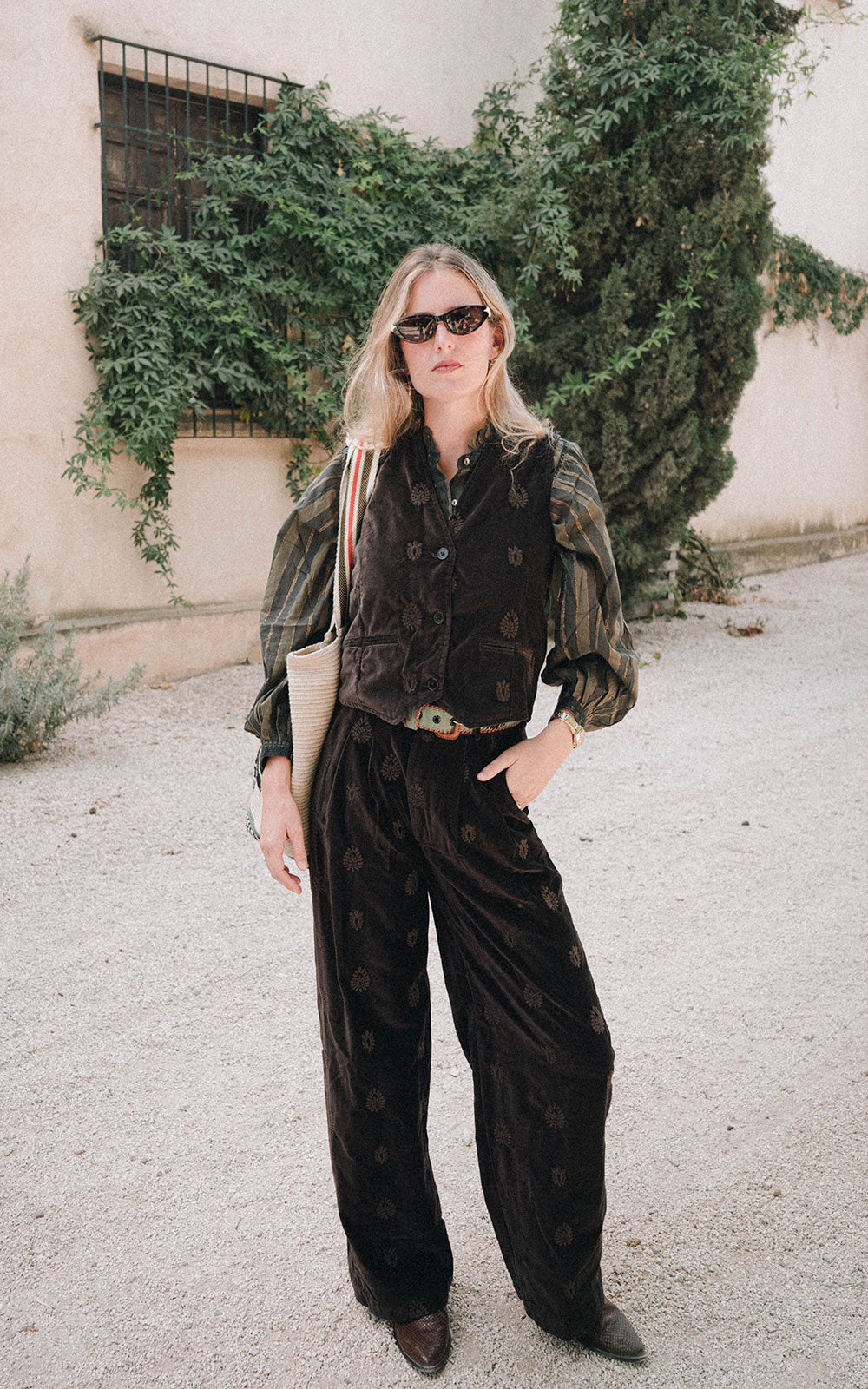 El chaleco Kafka en color macchiato Velluto está confeccionado en terciopelo de algodón, un tejido suave y mullido que combina cuerpo y fluidez. Su tono macchiato —un marrón cálido suavizado por la luz— evoca la riqueza del café matizado con crema, aportando profundidad y elegancia contenida.