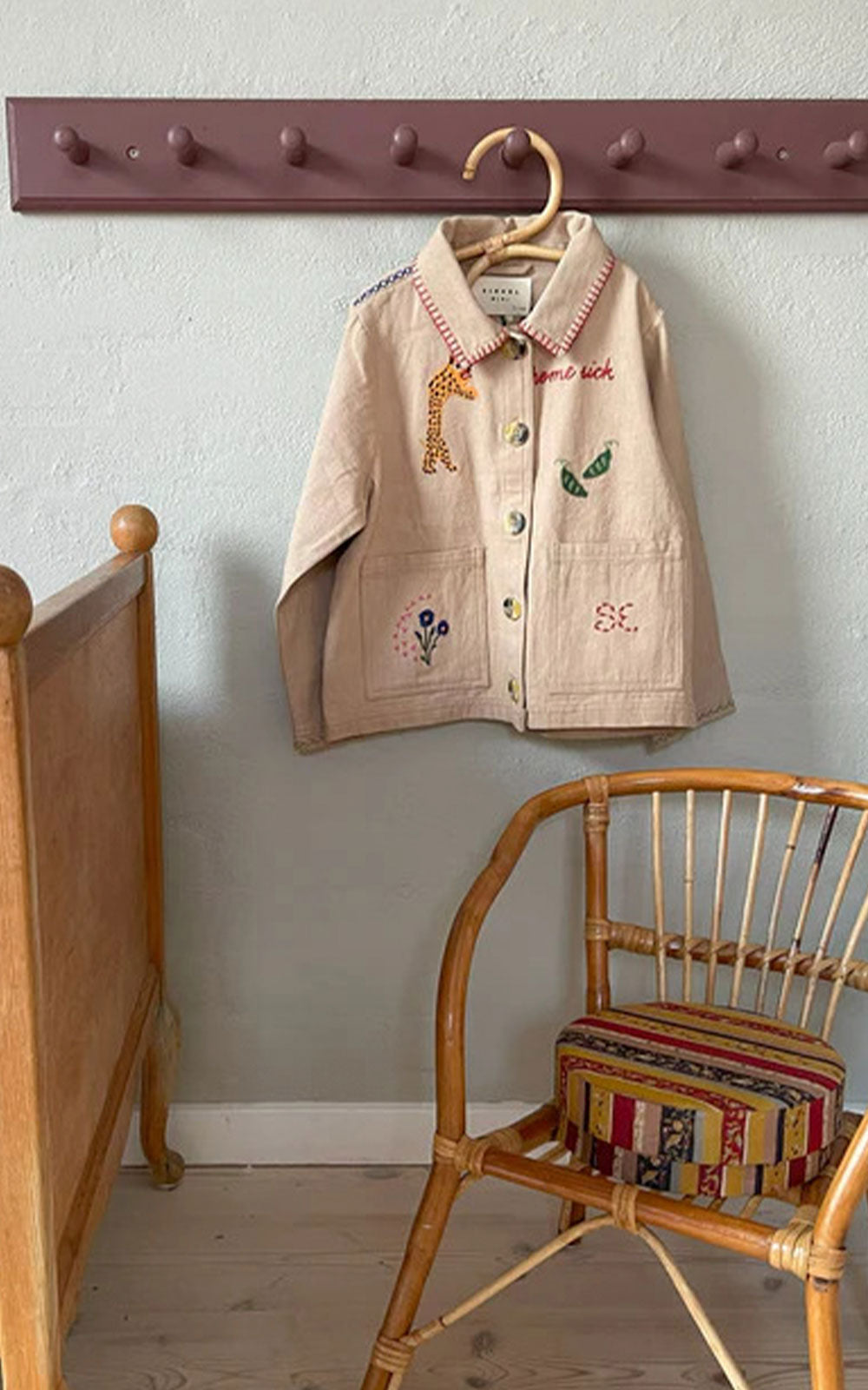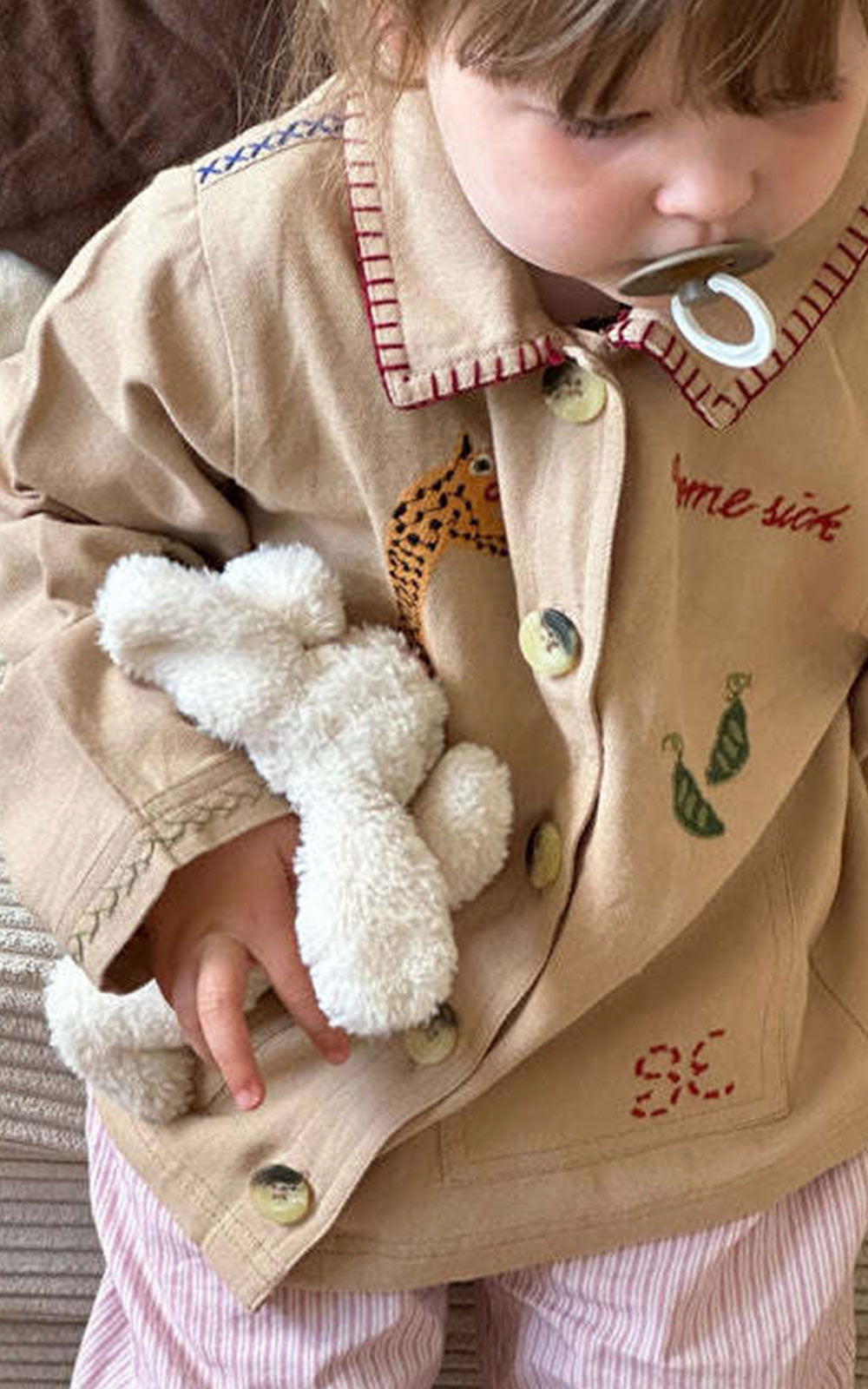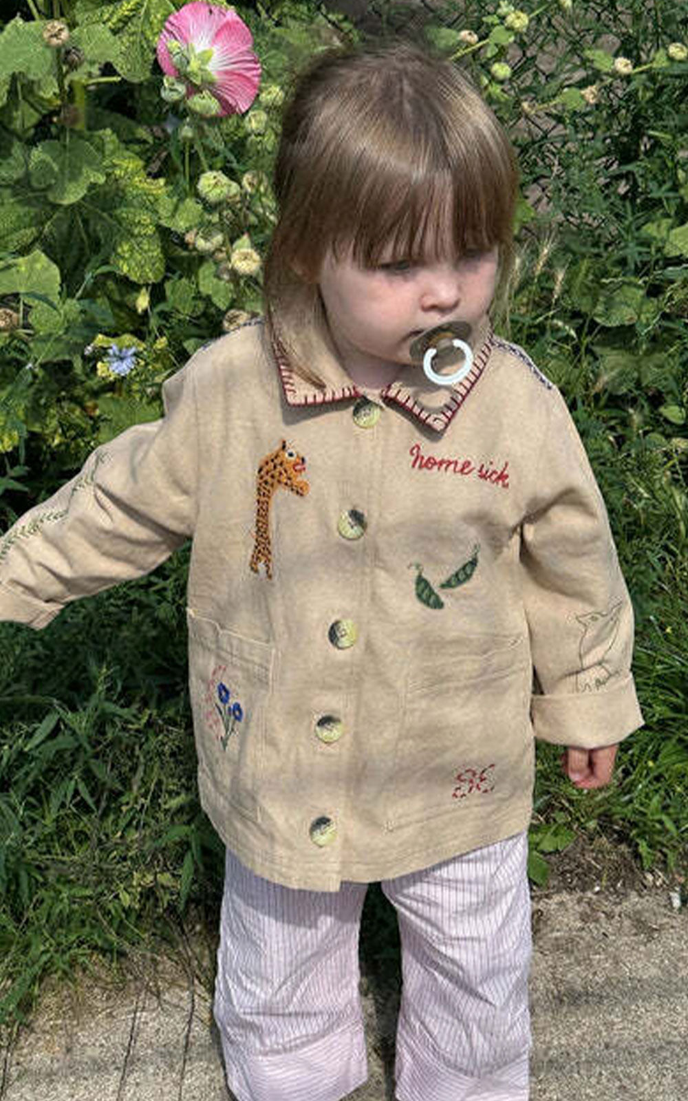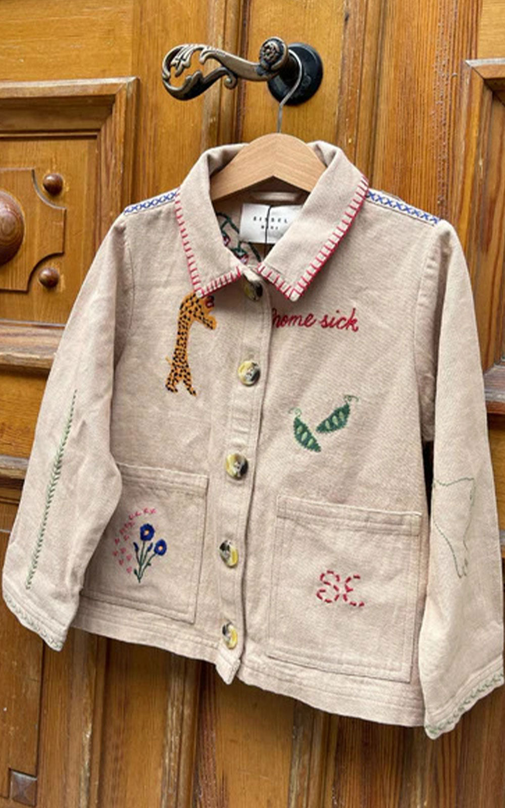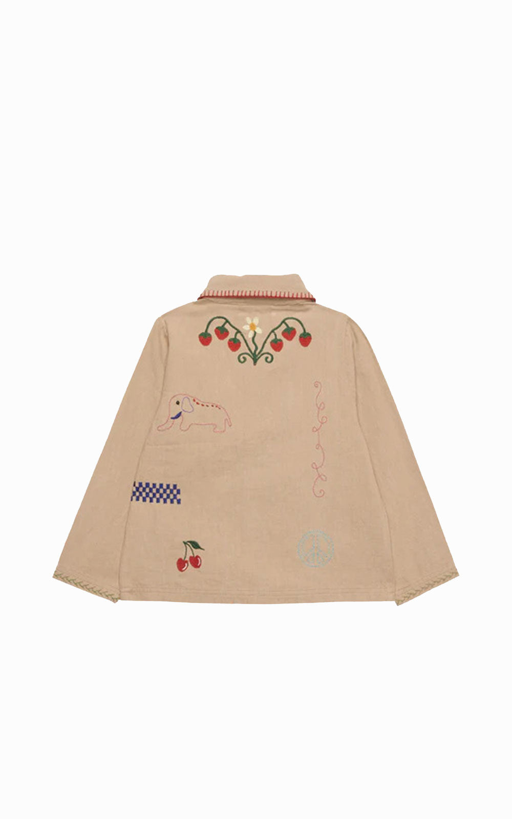 Chaqueta mini de algodón orgánico de corte informal. La chaqueta tiene un pequeño cuello camisero y mangas largas. En la parte delantera tiene dos bolsillos y en la tapeta hay botones. Está decorada con varios simpáticos motivos bordados: un leopardo, vainas de guisantes, cerezas, flores y muchos otros adorables motivos.