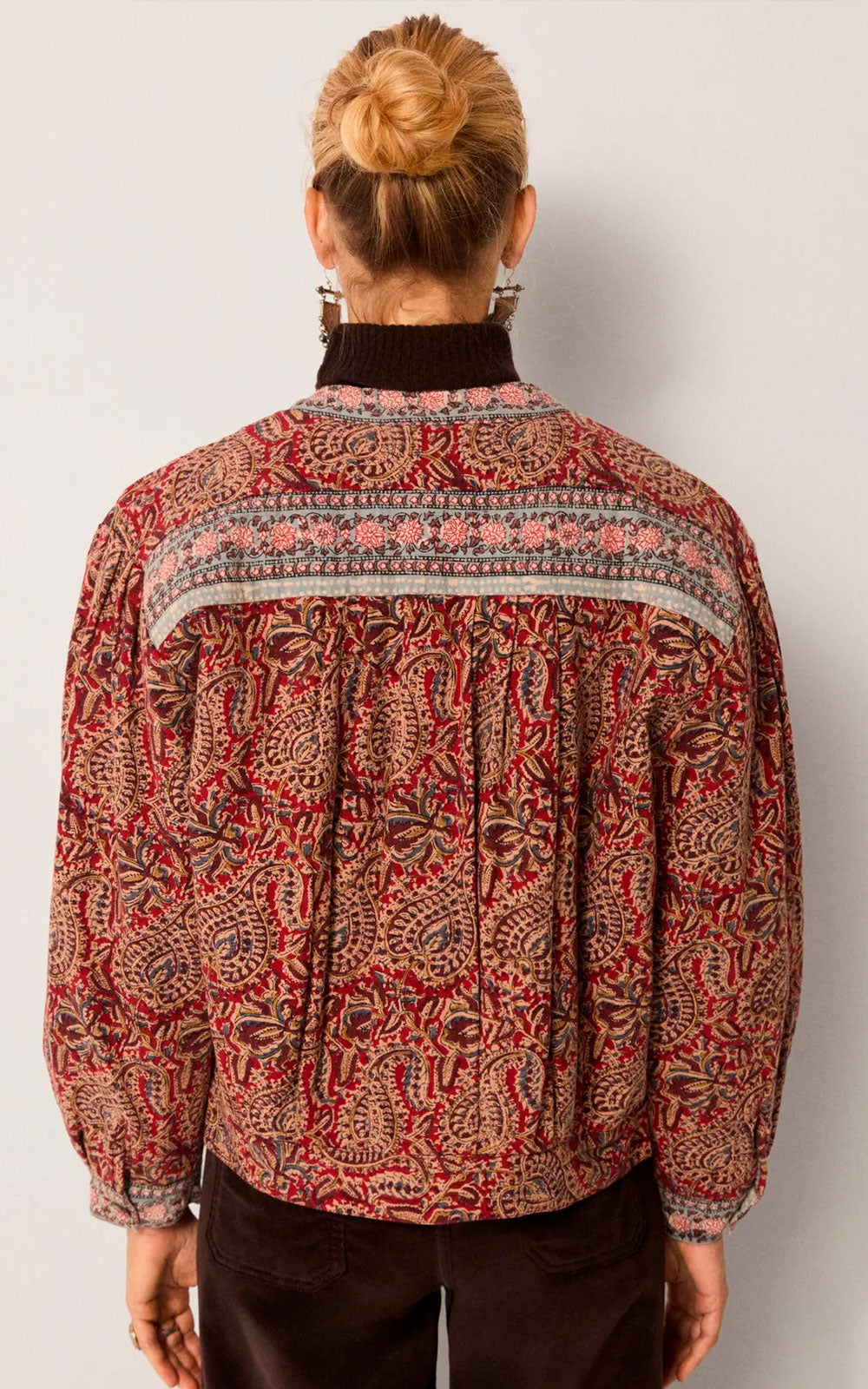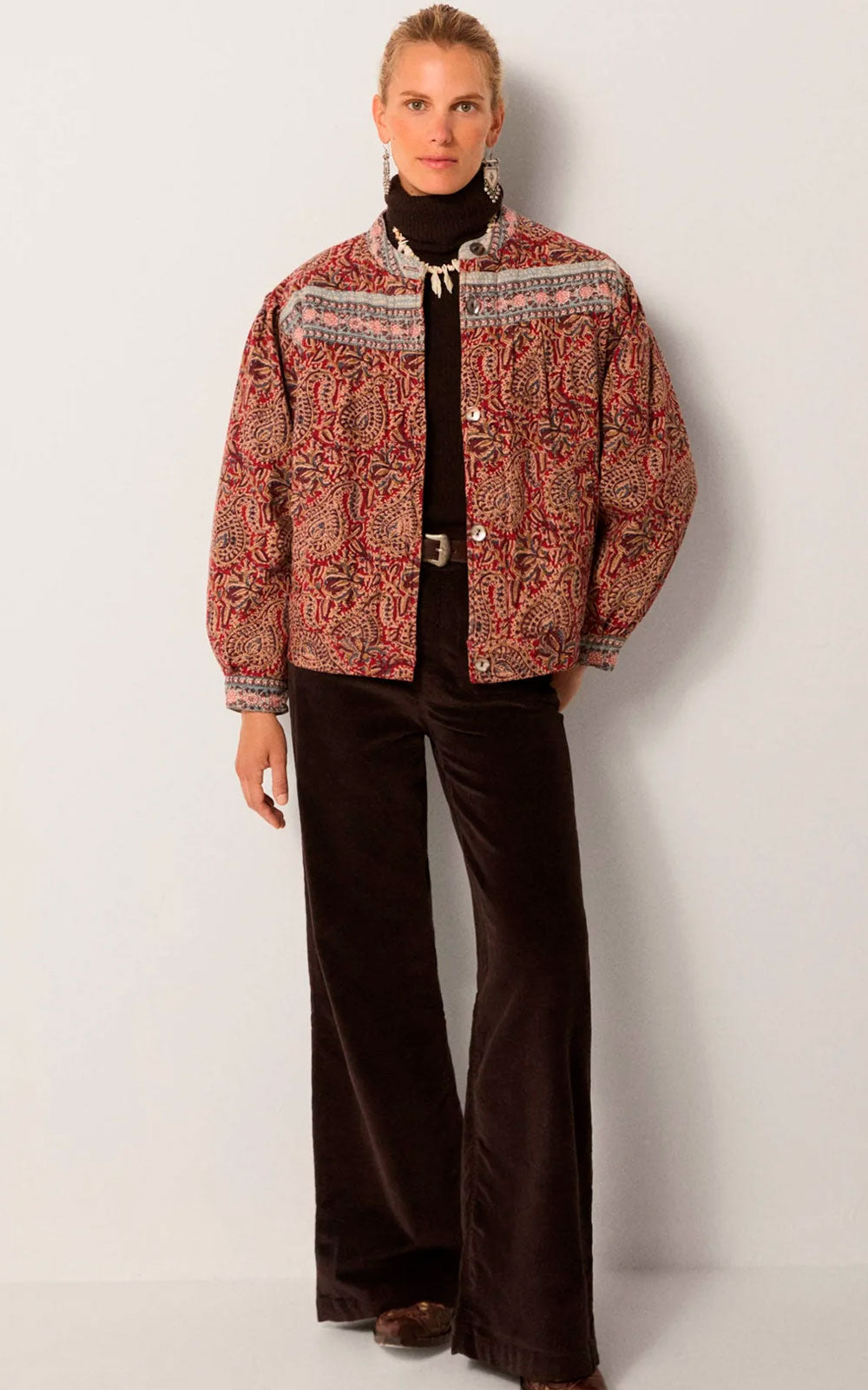 La chaqueta Olivia es una pieza envolvente y sofisticada, pensada para quienes encuentran belleza en los detalles. Confeccionada en algodón canvas tipo jacquard, presenta un estampado paisley que se despliega como un tapiz tejido, en tonos burdeos profundo, arena e índigo. Su diseño es cuadrado, abotonado y con un acolchado ligero que le da estructura sin perder ligereza.