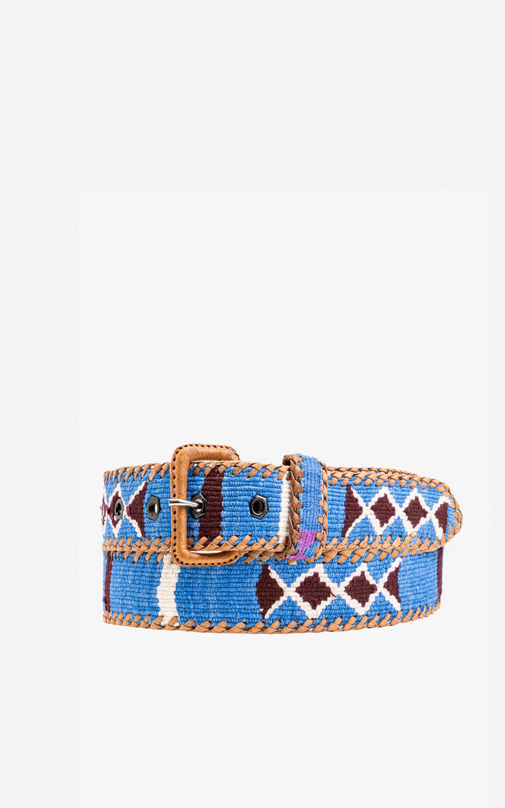 Cinturón con base de cuero sobre el que se tejen hilos de algodón. El acabado lateral es un cordón trenzado de piel natural. La hebilla de metal está forrada con piel y las presillas están bordadas con colores. El ancho del cinturón es de 3,5 cm.
