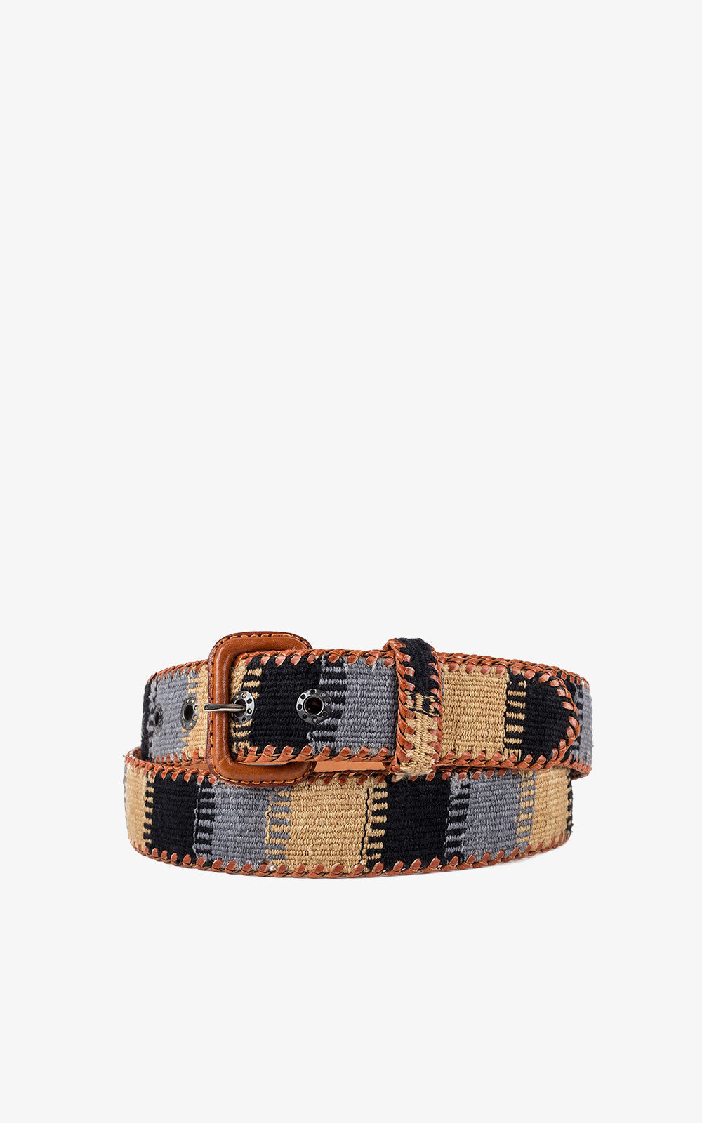 Cinturón con base de cuero sobre el que se tejen hilos de algodón. El acabado lateral es un cordón trenzado de piel natural. La hebilla de metal está forrada con piel y las presillas están bordadas con colores. El ancho del cinturón es de 3,5 cm.
