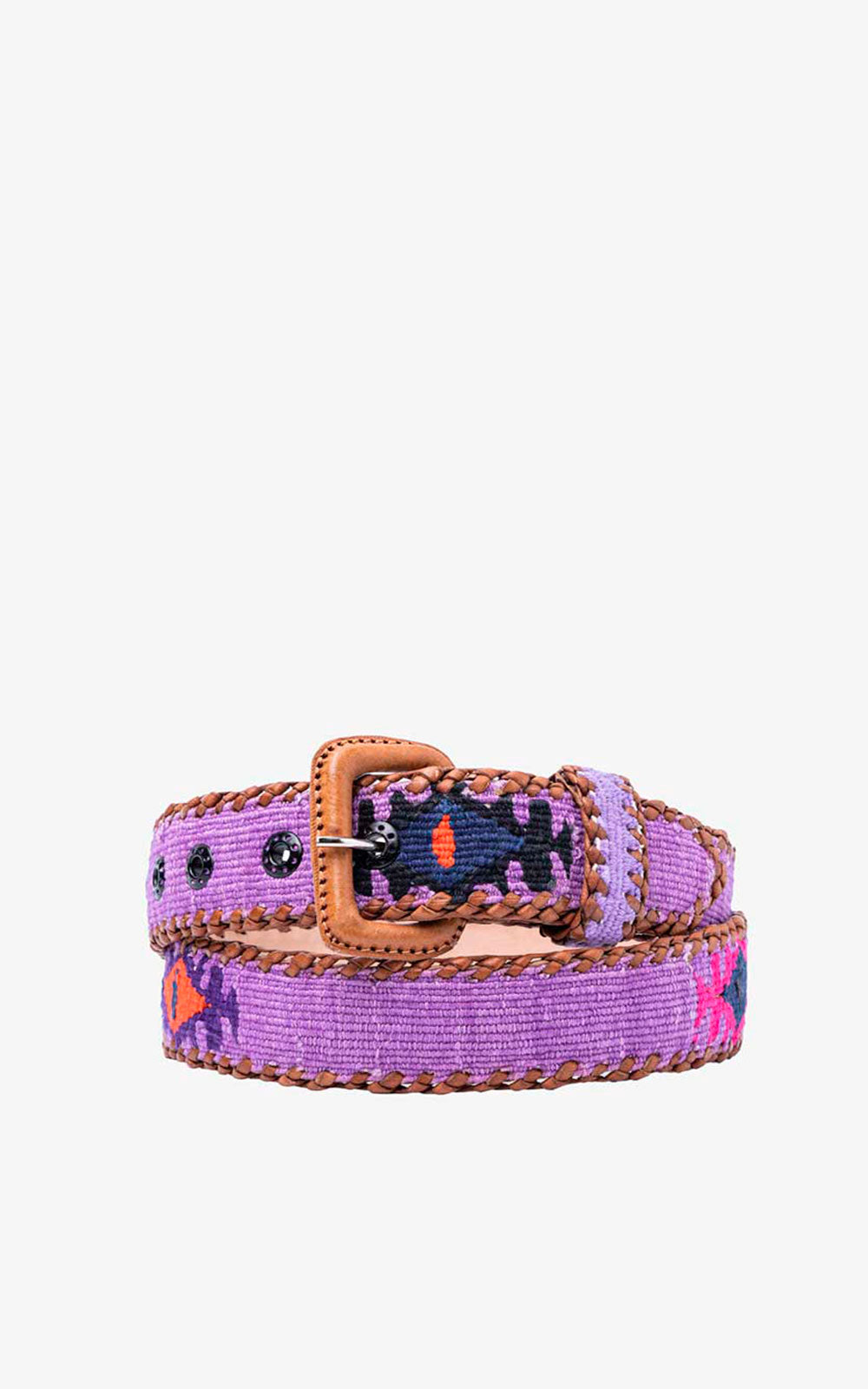 Cinturón con base de cuero sobre el que se tejen hilos de algodón. El acabado lateral es un cordón trenzado de piel natural. La hebilla de metal está forrada con piel y las presillas están bordadas con colores. El ancho del cinturón es de 3,5 cm.