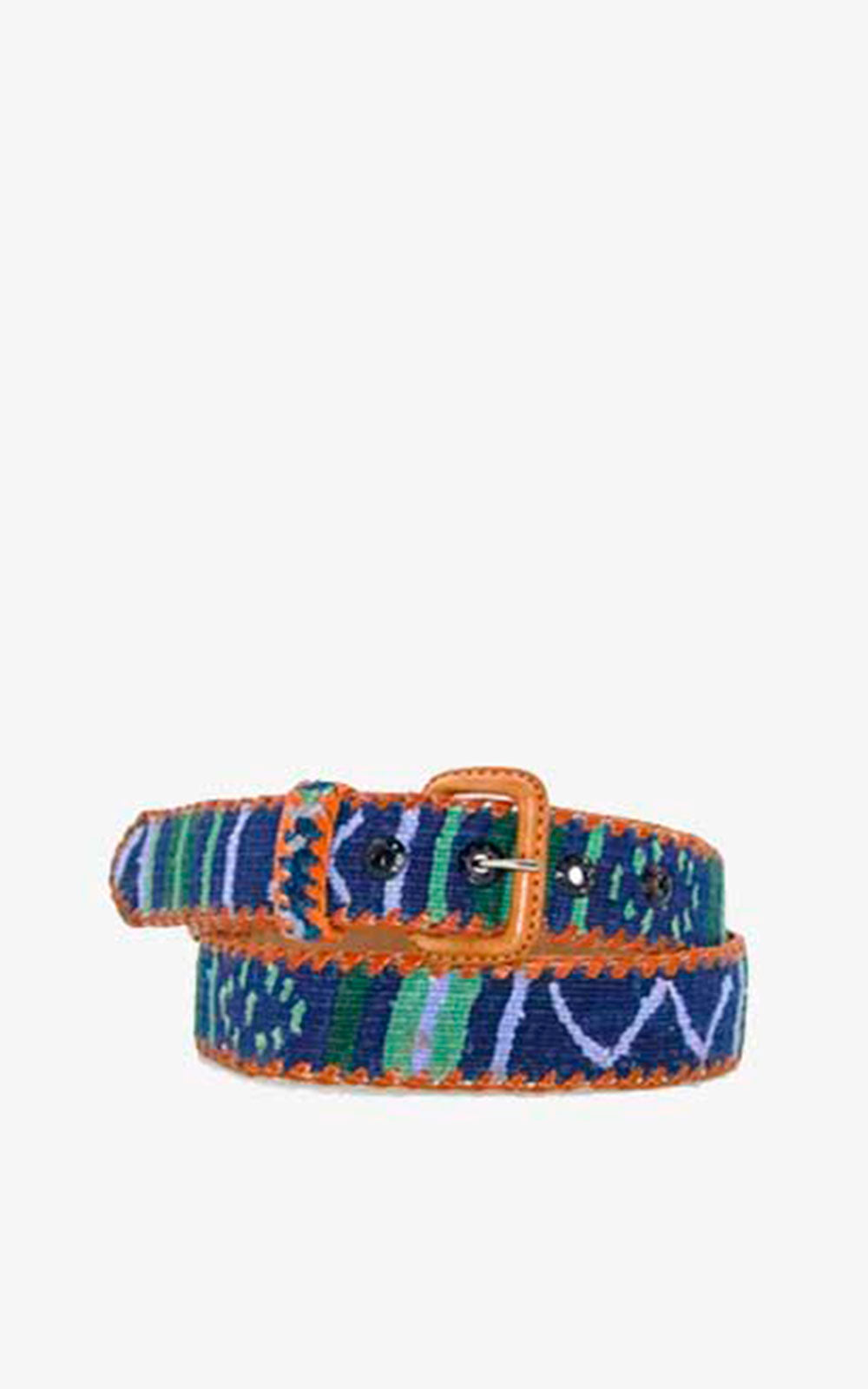 Los cinturones étnicos están hechos a mano por artesanos de pequeñas comunidades de Guatemala. Este artículo artesanal marcó el inicio de la marca convirtiéndose actualmente en el producto estrella de todas sus colecciones al contar con más de 50 colores diferentes, renovándose los diseños y tonalidades en cada temporada.