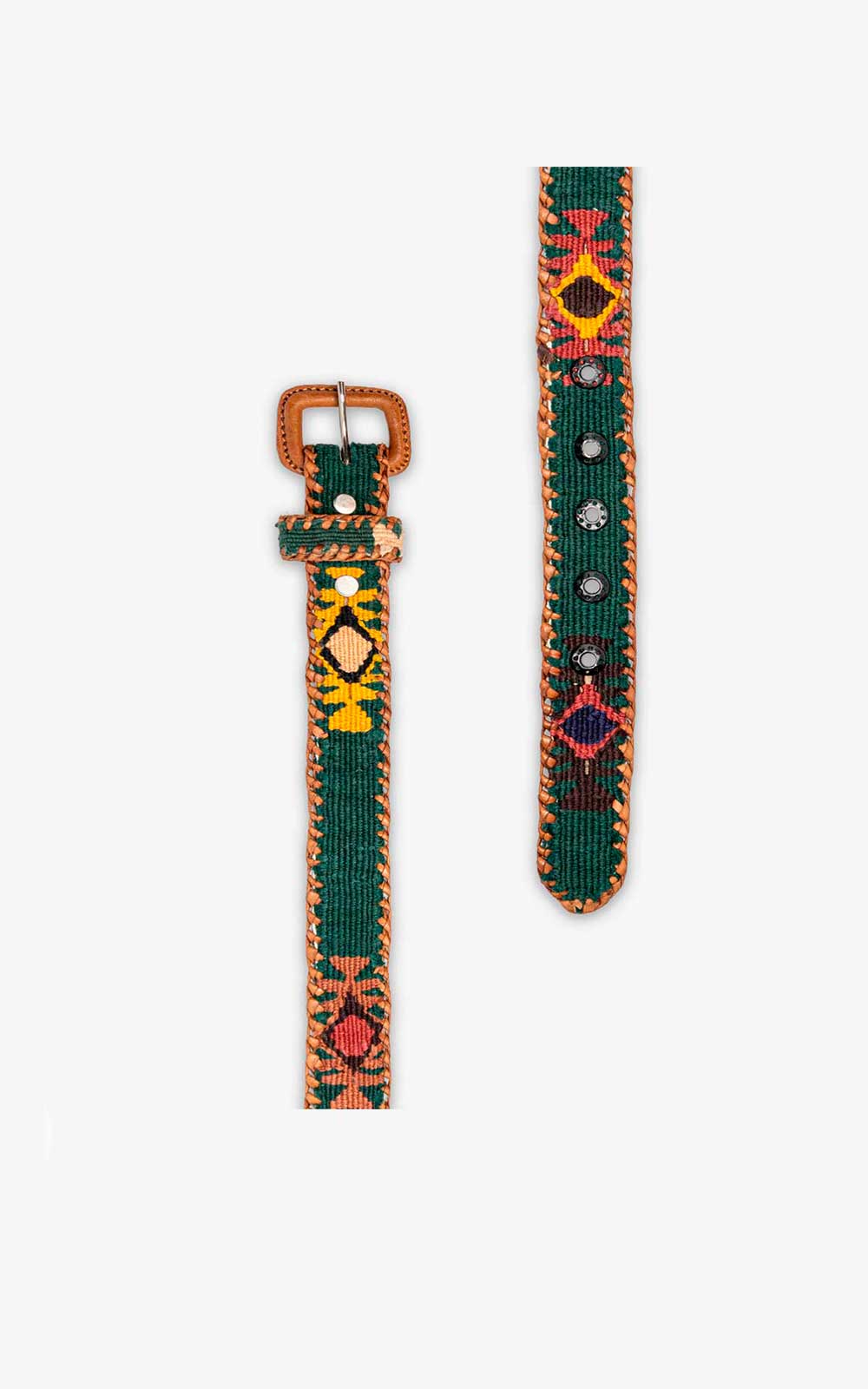Cinturones con base de cuero y con decorados étnicos de diferentes colores trenzados con hilos de algodón. Los rombos etnicos de diferentes colores están tejidos a mano (*). La hebilla de metal está forrada en piel.