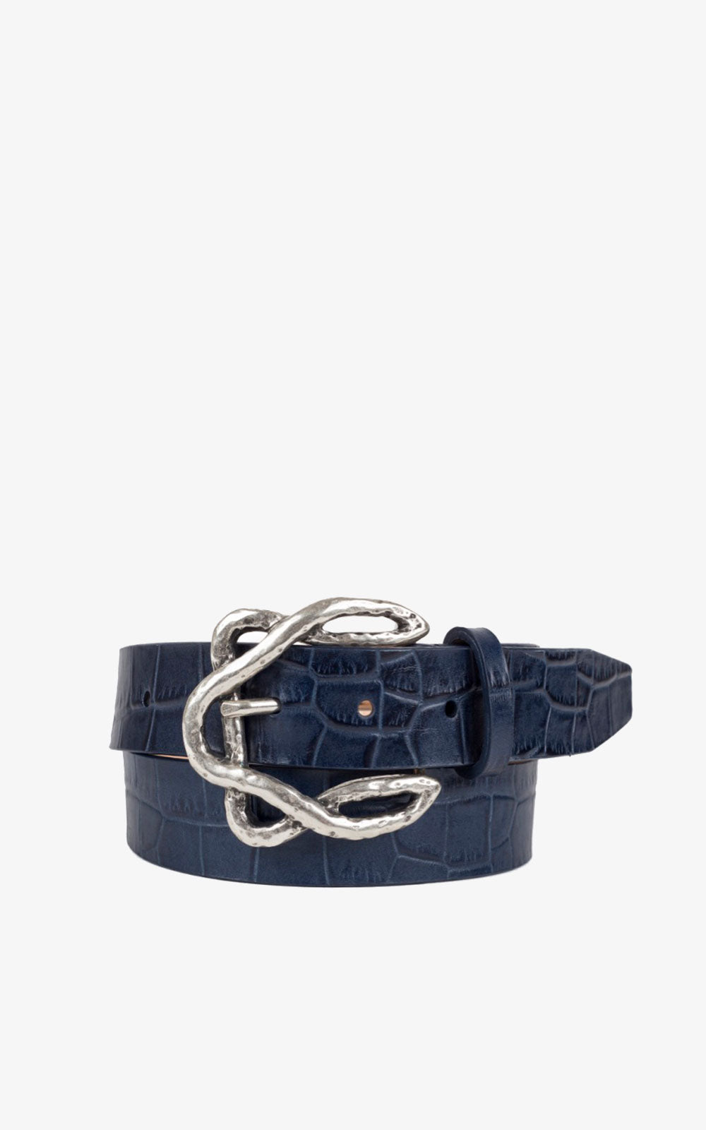 Este cinturón es una pieza que trasciende temporadas. Elaborado en piel de alta calidad con grabado tipo cocodrilo, destaca por su hebilla de zamak: una forma serpenteante, orgánica y poderosa que aporta presencia instantánea.