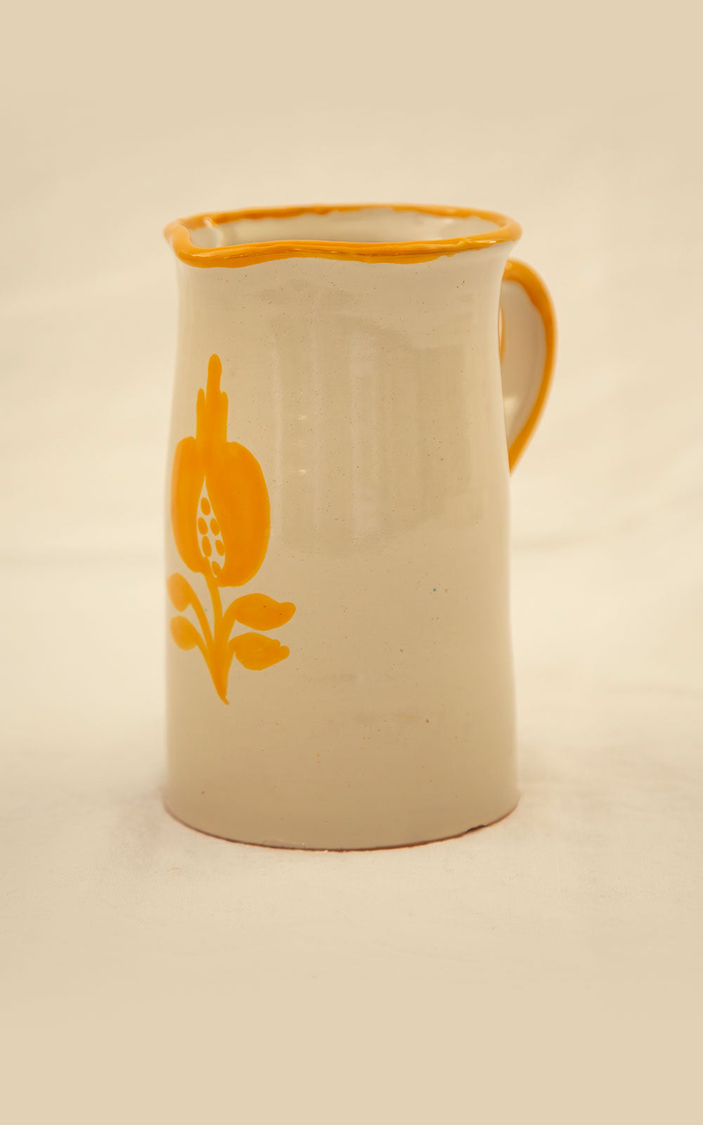 Jarra de 1 litro de capacidad de cerámica con diseño de flor pintada a mano en un taller de artesanos de Granada.