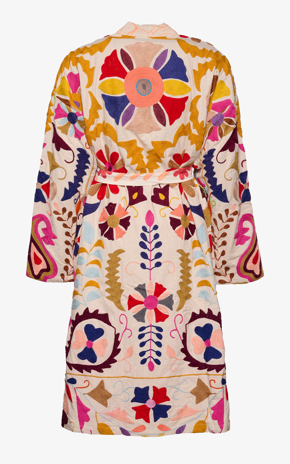 Este kimono está confeccionado en una manta de algodón kantha vintage y decorado con coloridos bordados suzani por todas partes. Es un kimono largo que viene con un cinturón desmontable. El kimono es de gran tamaño y está confeccionado con hombros caídos, mangas largas y anchas y bolsillos ocultos en la costura lateral. Al ser de talla única, abarca desde una 34 a una 40.