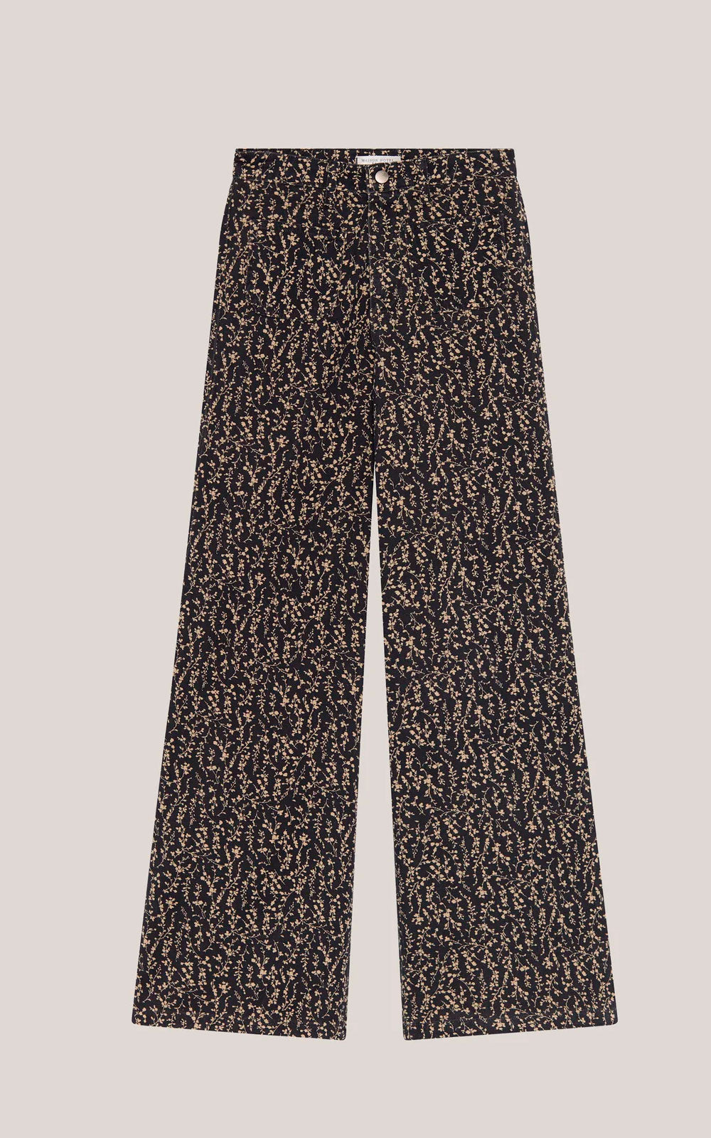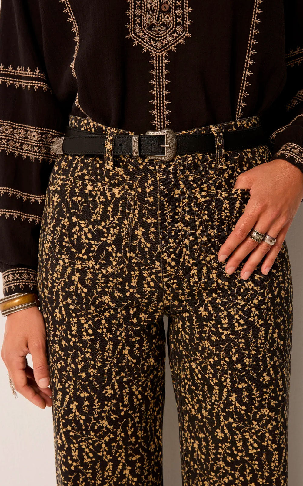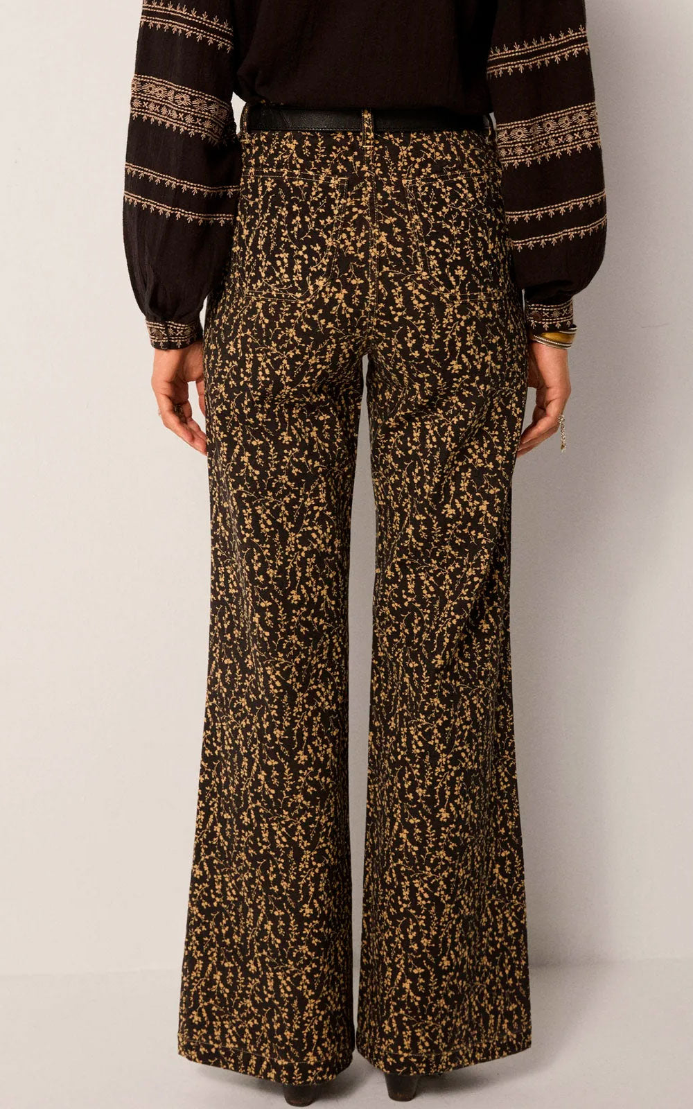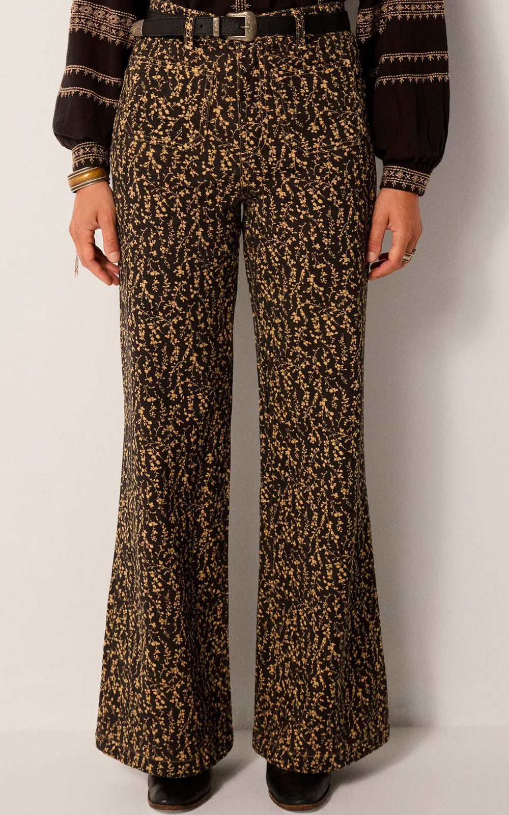Confeccionado en algodón con un leve toque de elastano, su corte es recto con una ligera campana: favorecedor, cómodo y con actitud. El estampado —enredaderas ocres sobre fondo negro— tiene el encanto de una tela antigua rescatada de un baúl en una casa de campo ibicenca.