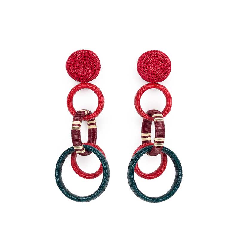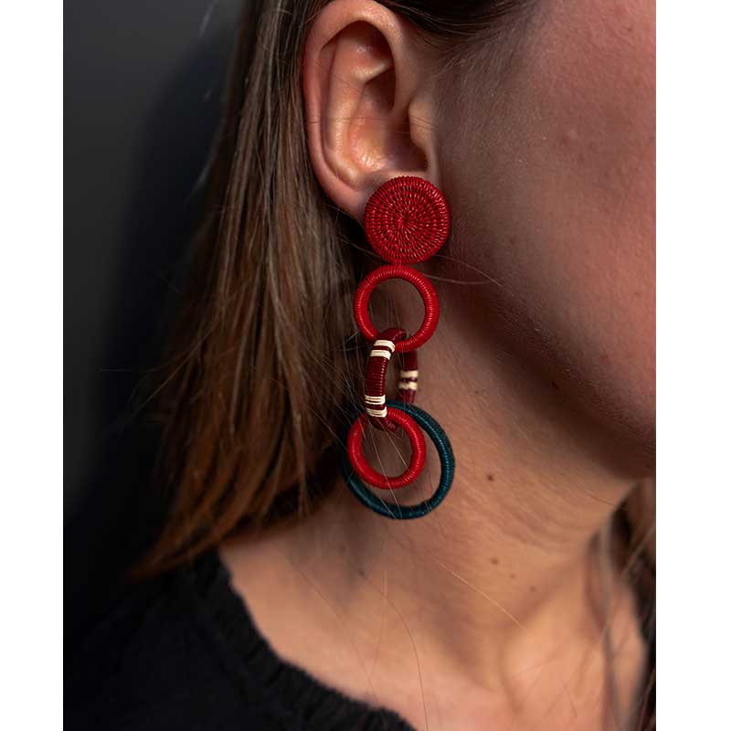 Pendiente medallón con triple aros gruesos elaborado a mano con palma de werrengue por artesanos de Colombia.