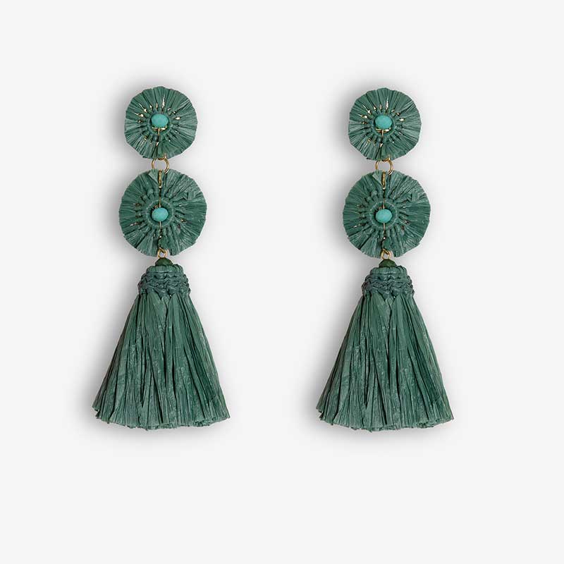 Pendiente largo de rafia natural con flecos largos en su parte inferior elaborado a mano en la India. No tienen opción a devolución ni cambio.