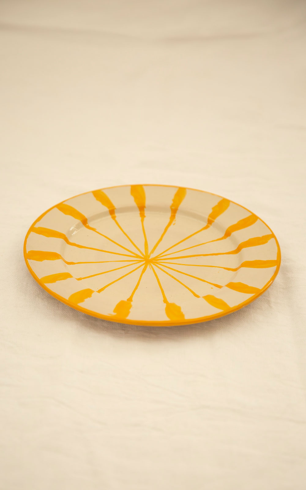 Plato de cerámica con diseño de rayas pintado a mano en un taller de artesanos de Granada.