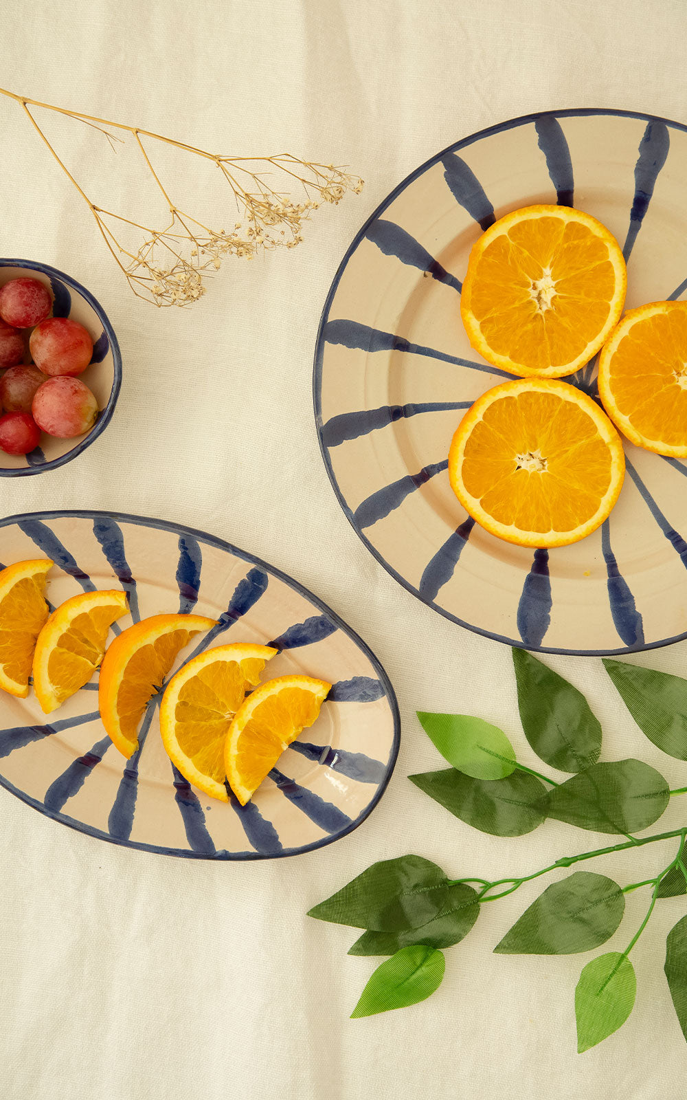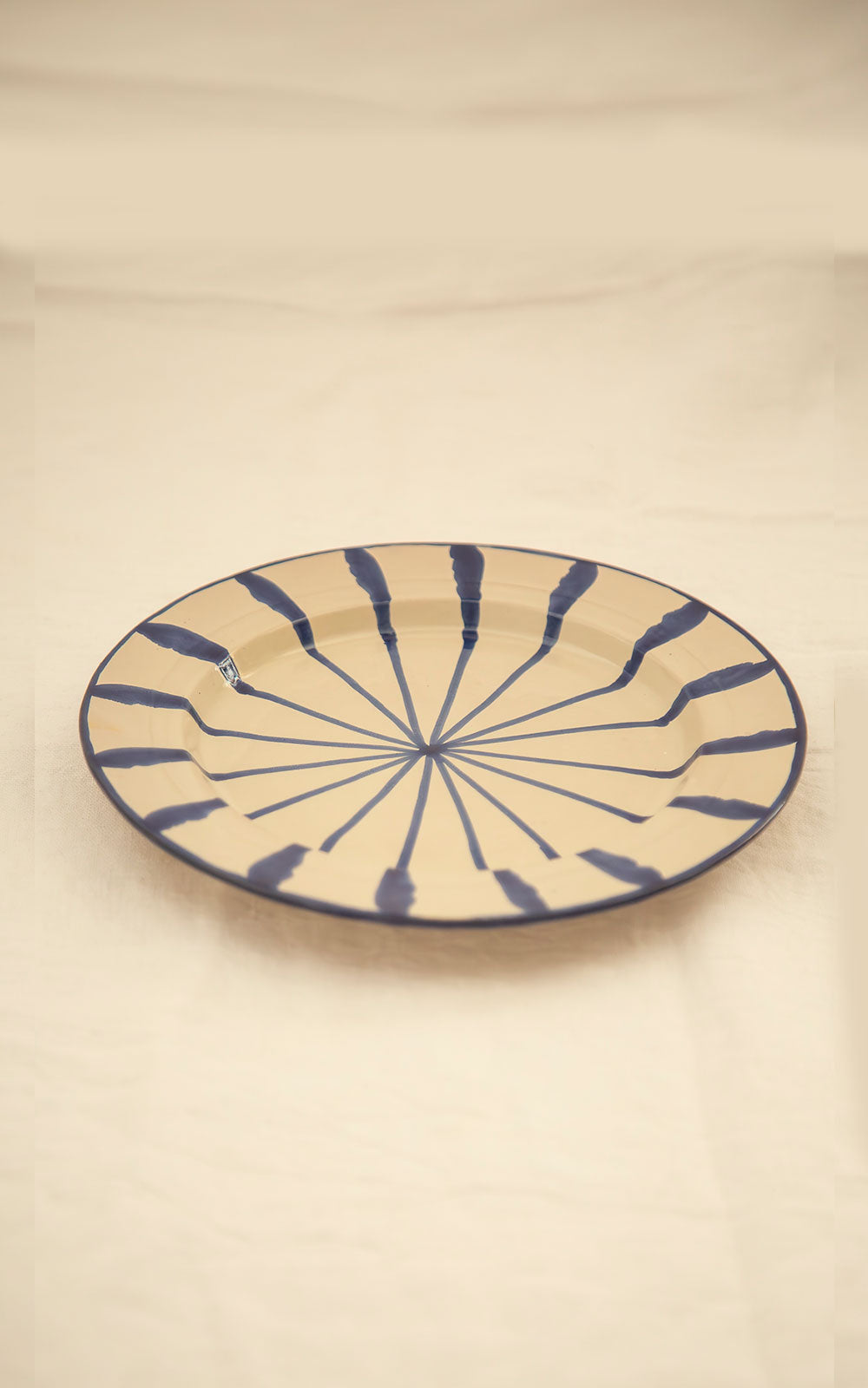 Plato de cerámica con diseño de rayas pintado a mano en un taller de artesanos de Granada.