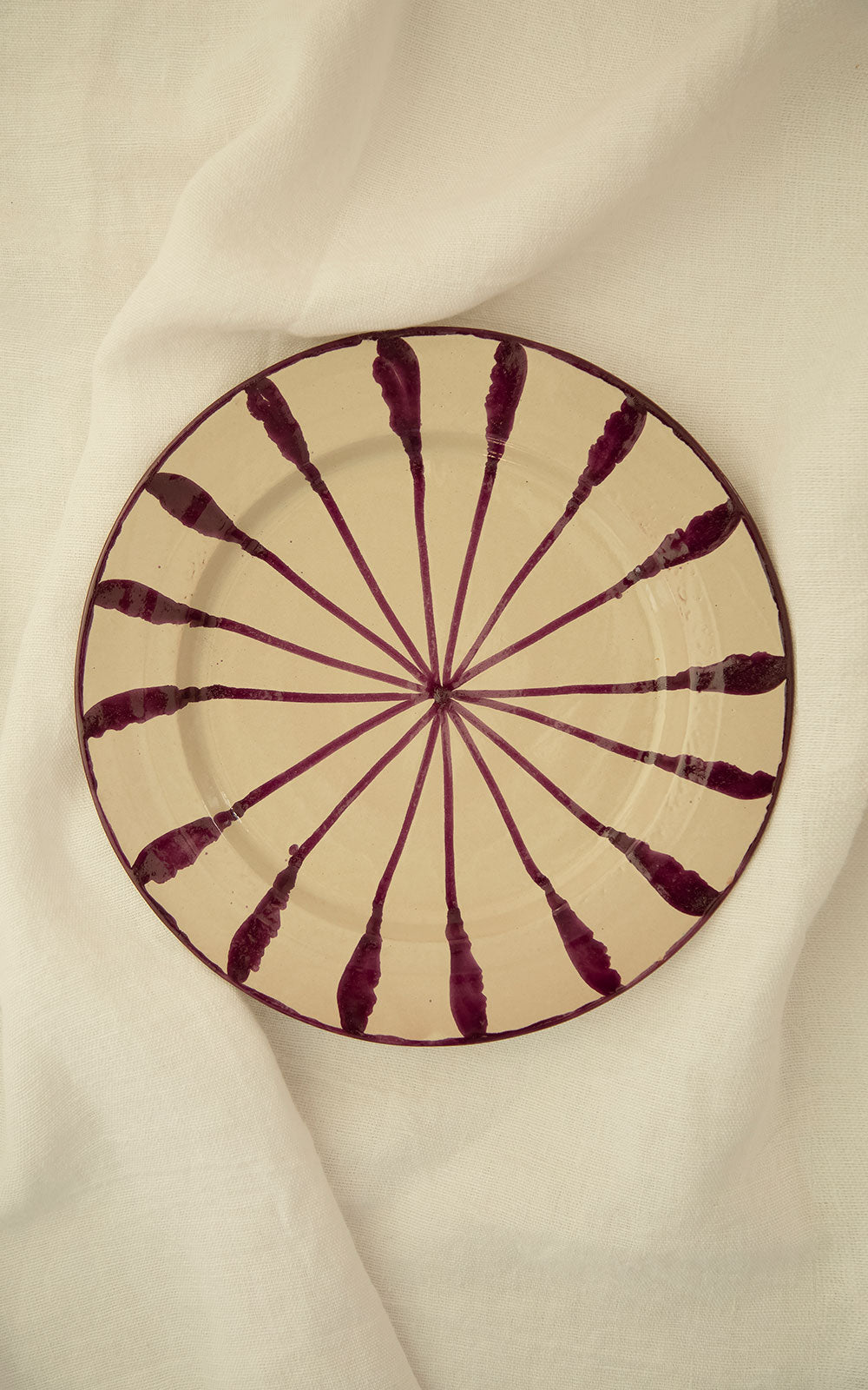 Plato de cerámica con diseño de rayas pintado a mano en un taller de artesanos de Granada.