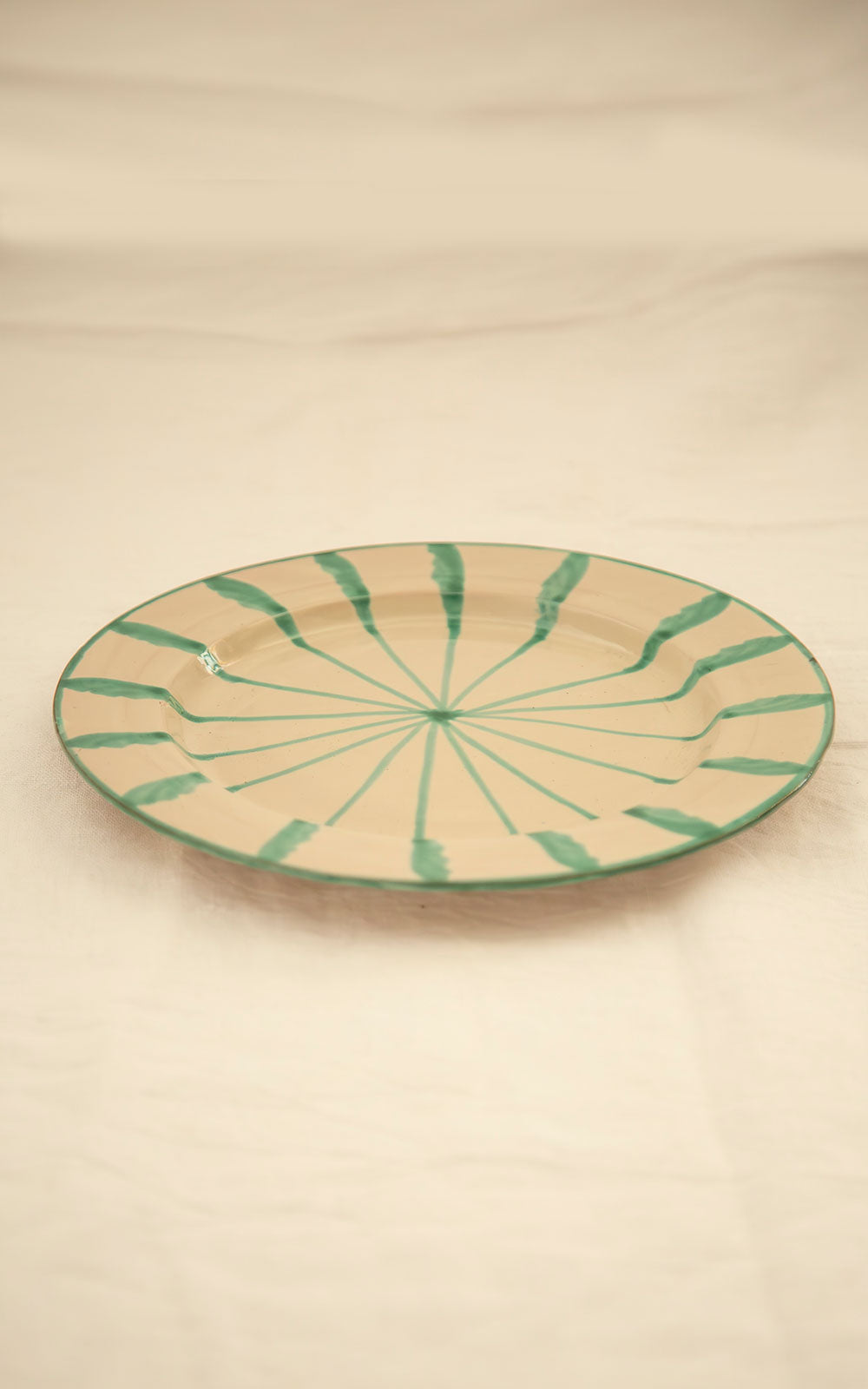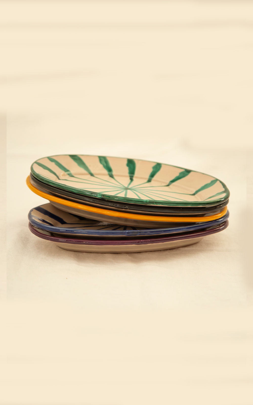 Plato de cerámica con diseño de rayas pintado a mano en un taller de artesanos de Granada.