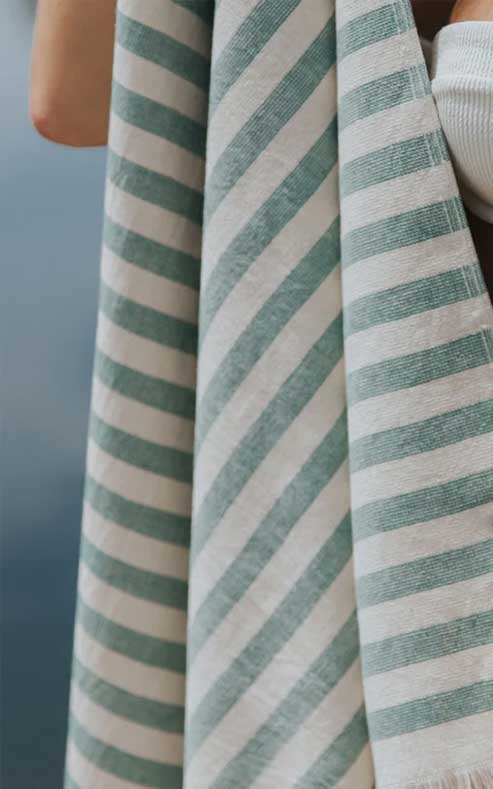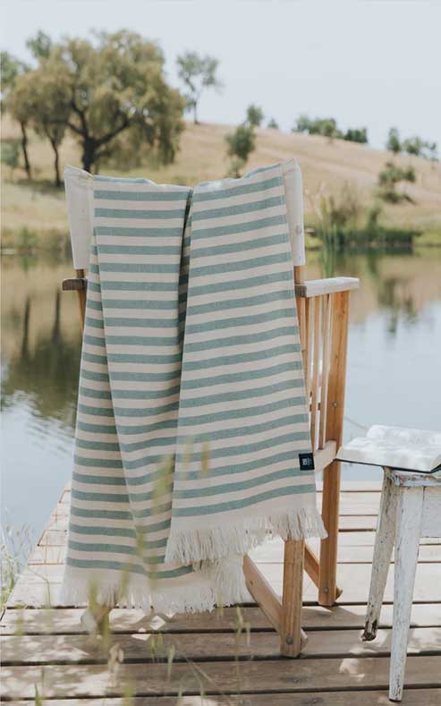 Las toallas de playa Barra, con sus finas rayas, están inspiradas en el faro de Barra, en Praia da Barra, Aveiro, el mayor faro de Portugal.