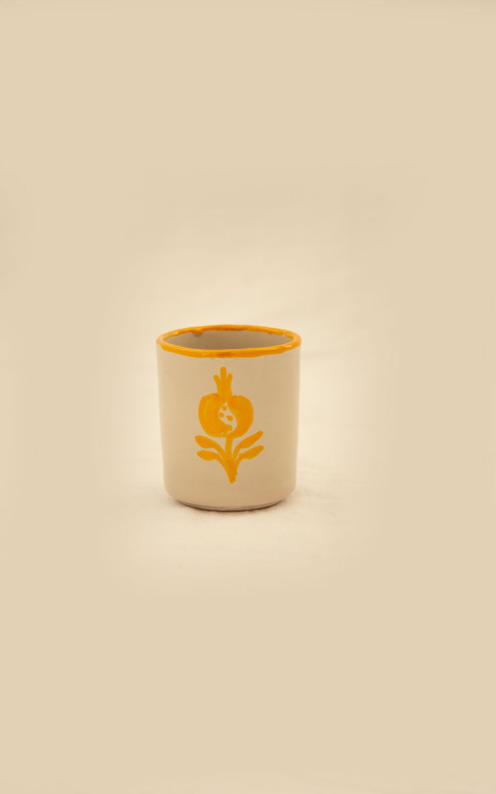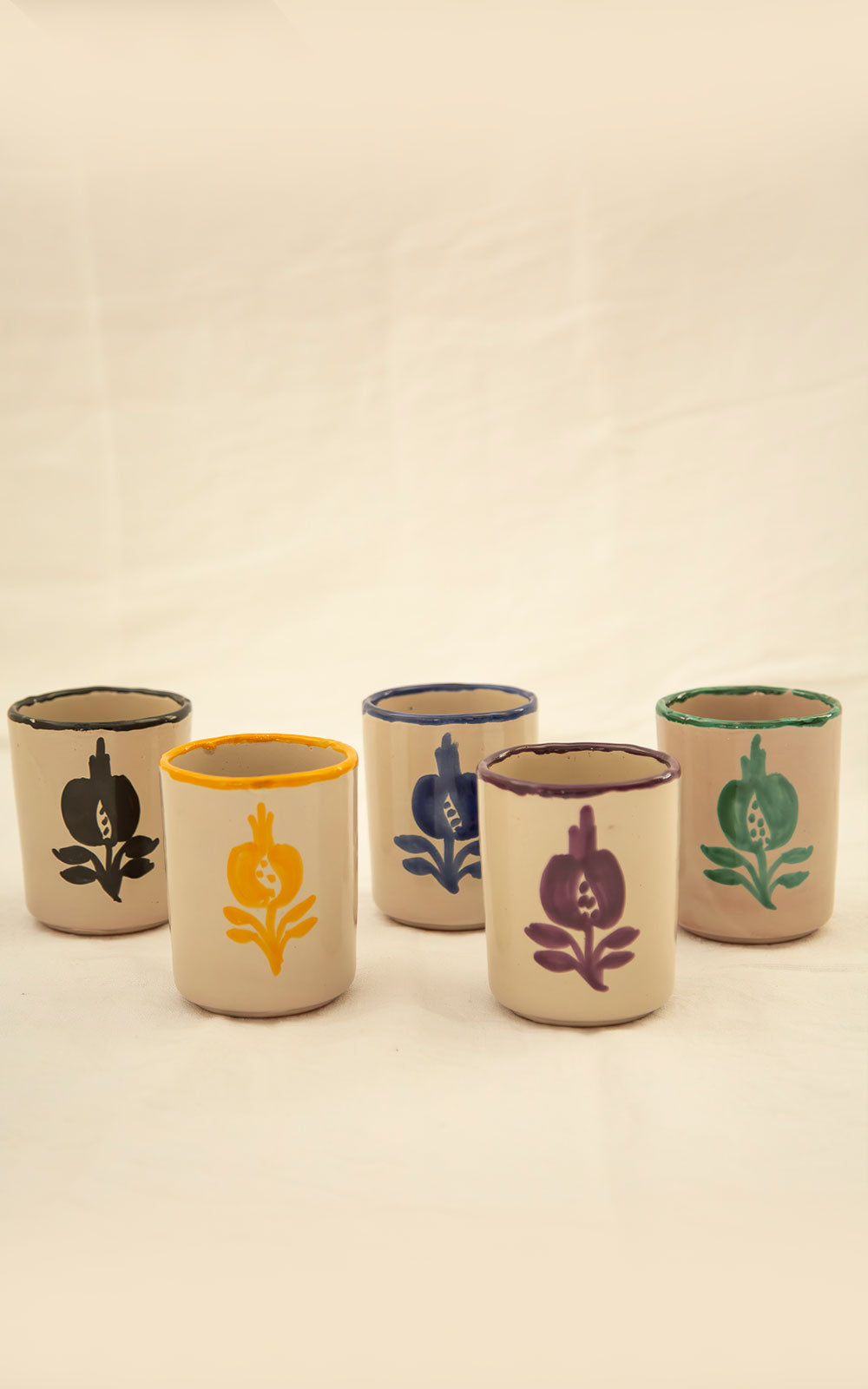Vaso individual de cerámica con diseño de flor pintada a mano en un taller de artesanos de Granada.