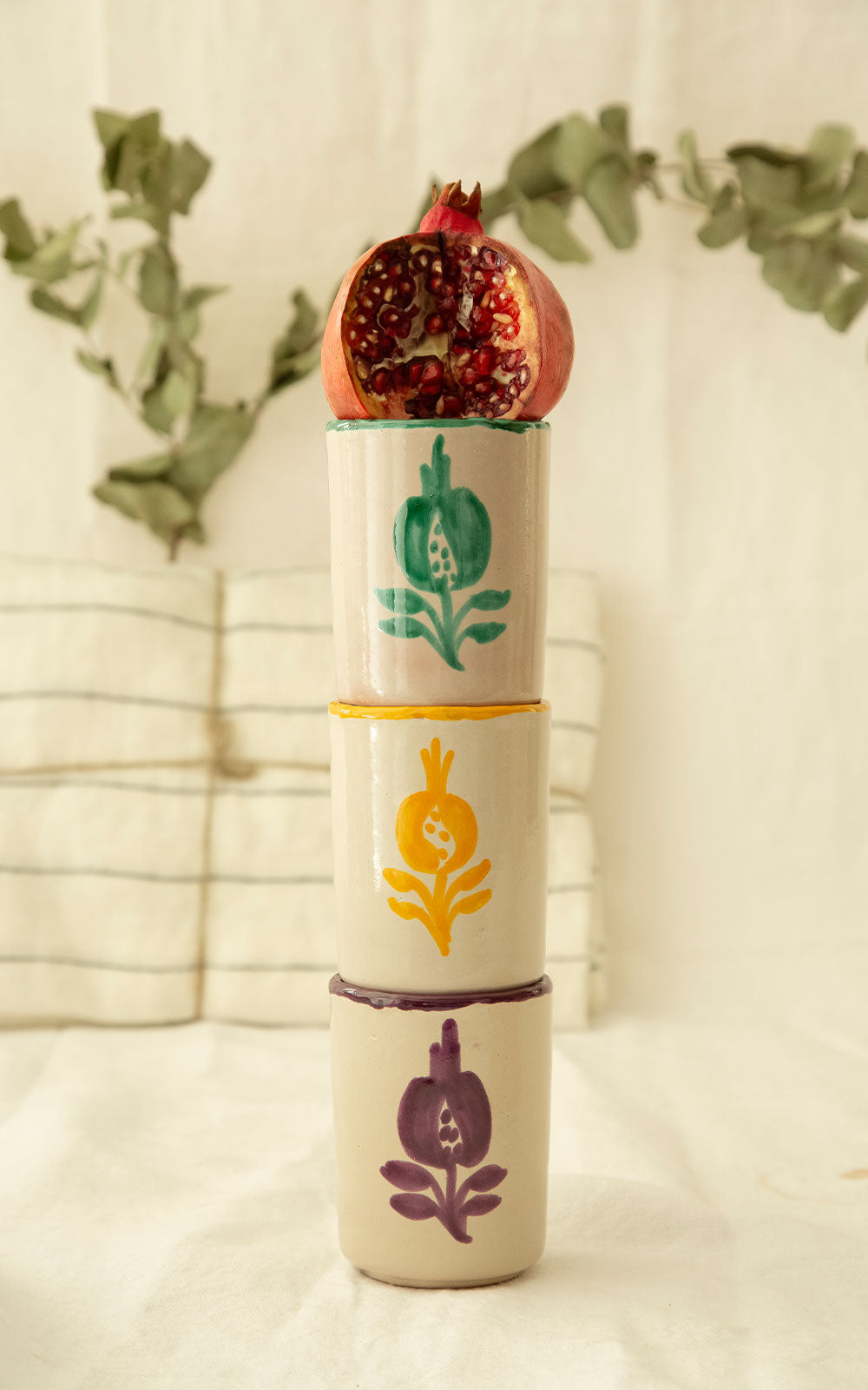 Vaso individual de cerámica con diseño de flor pintada a mano en un taller de artesanos de Granada.