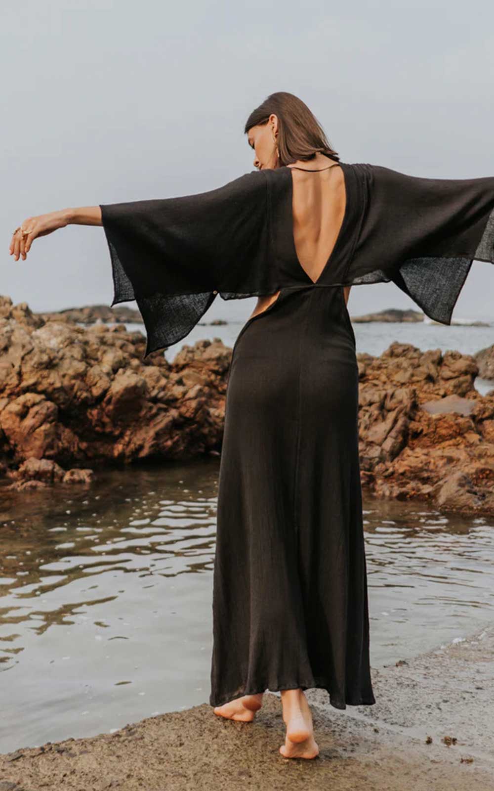 Vestido confeccionado con algodón. El escote en pico y la espalda se combinan a la perfección con las mangas abiertas de tres cuartos.