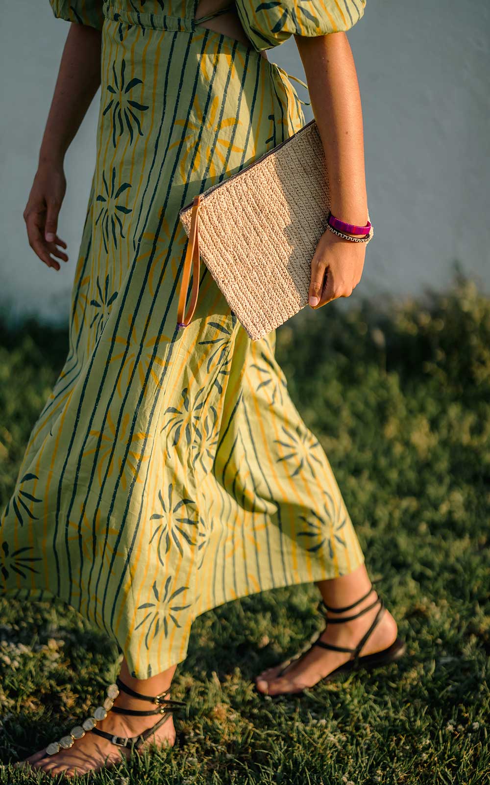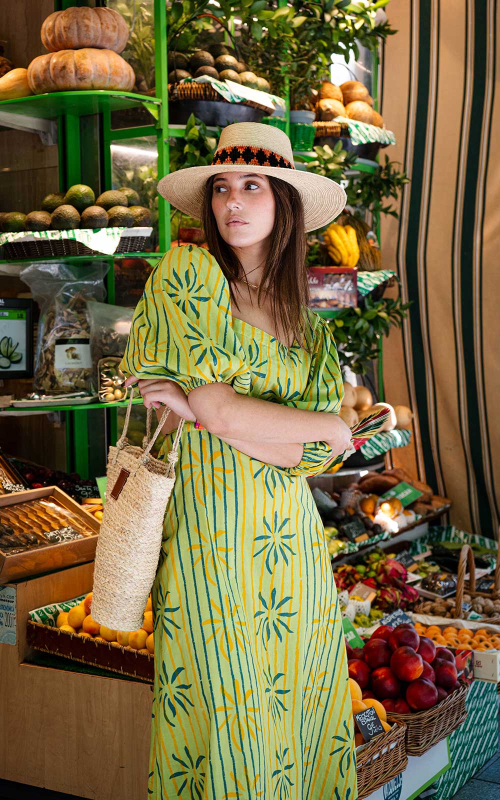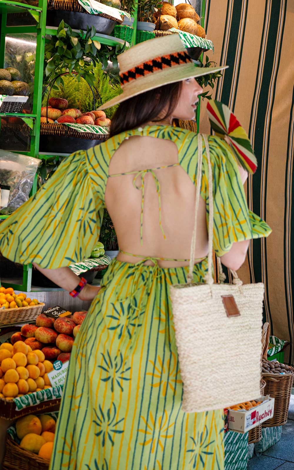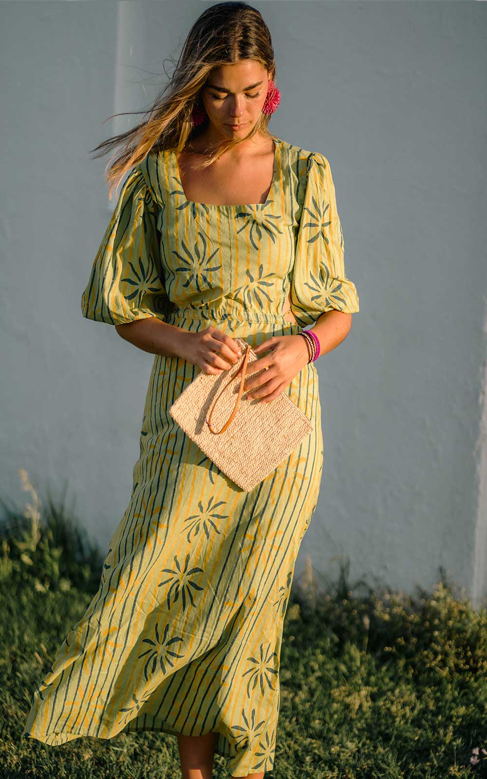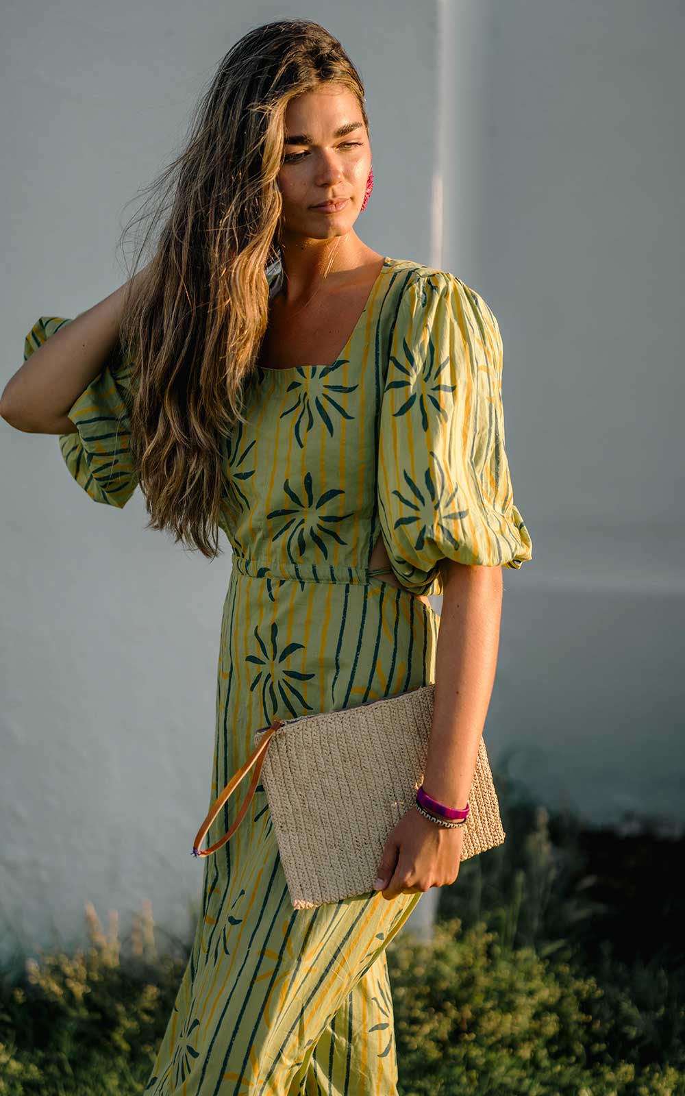Vestido largo con espalda abierta, regulable en cintura y mangas abullonadas. Estampado Block Print de soles y rayas con tintes naturales en tonos verdes