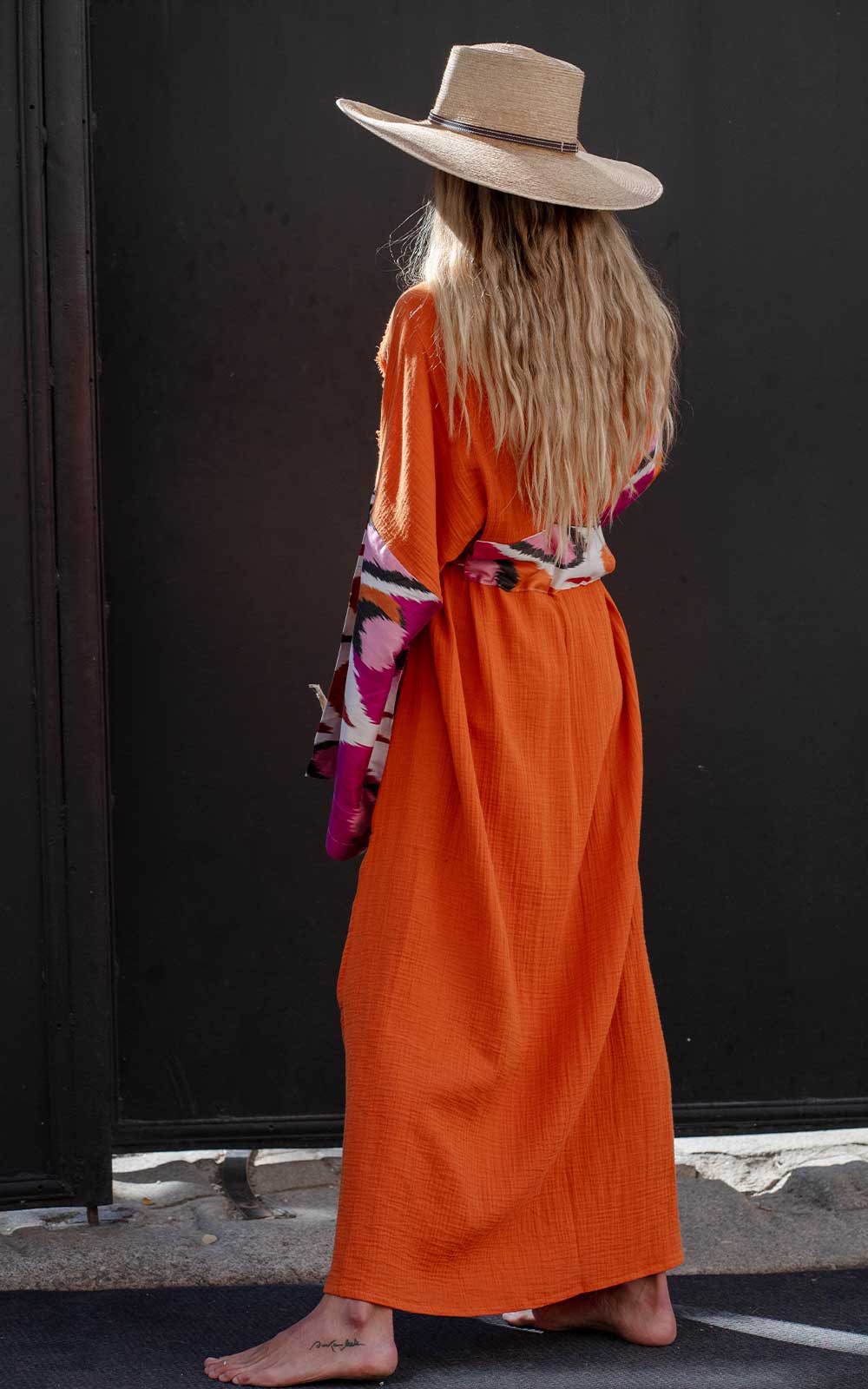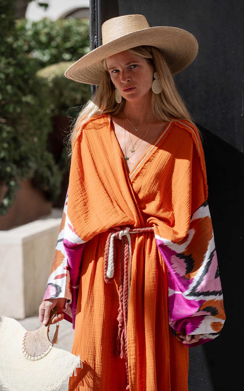 Vestido abierto de algodón con mangas y espalda de seda ikat. Se puede llevar tanto abierto como un kaftan o cerrado como vestido al disponer de dos cordones de algodón grueso.Ideales para los eventos de este verano