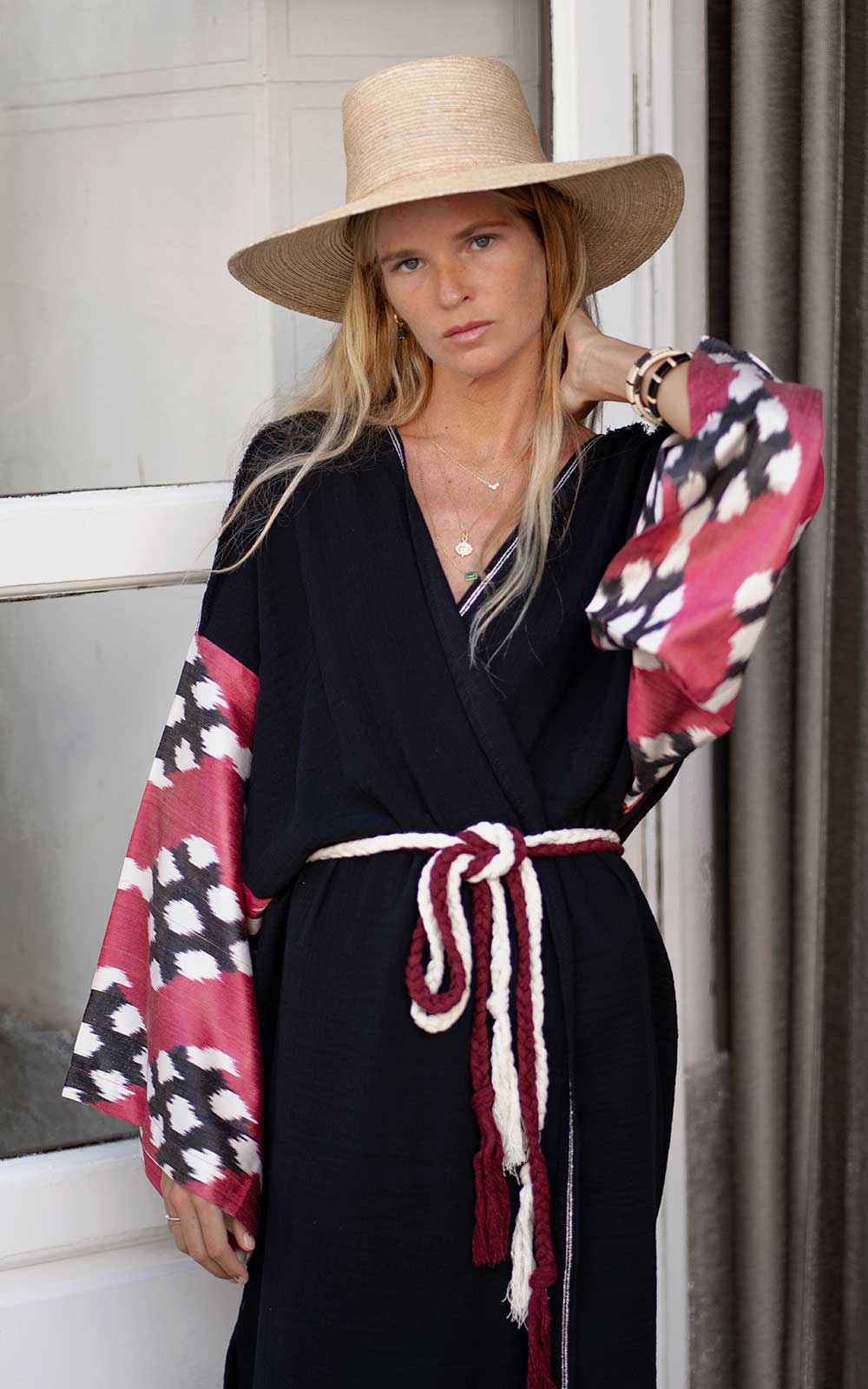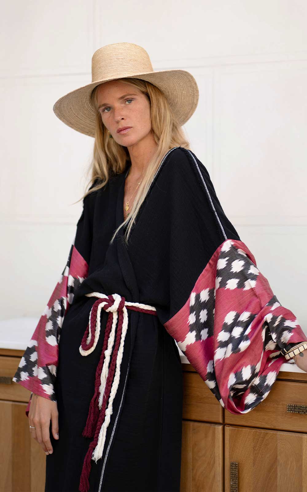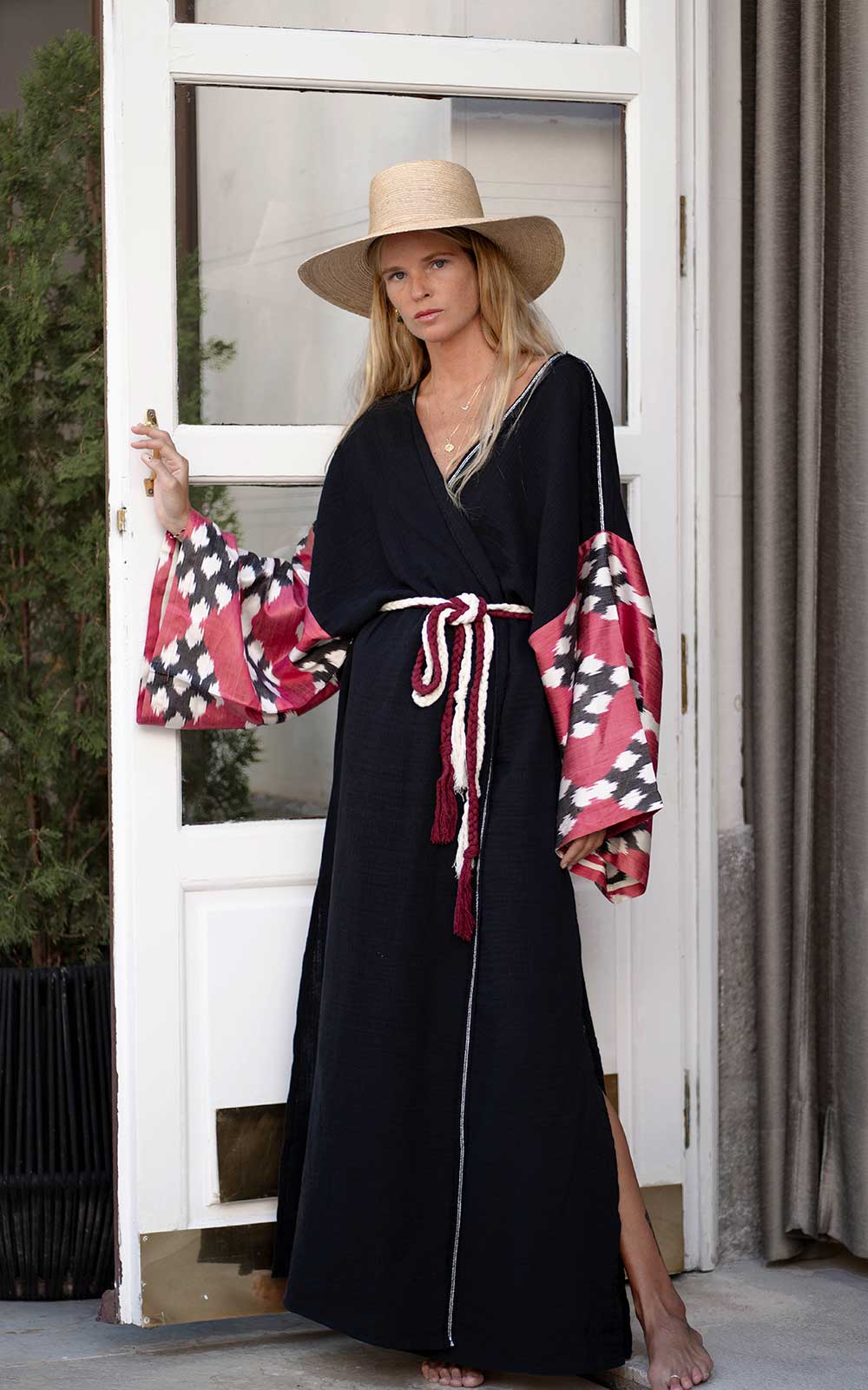Vestido abierto de algodón con mangas y espalda de seda ikat. Se puede llevar tanto abierto como un kaftan o cerrado como vestido al disponer de dos cordones de algodón grueso.Ideales para los eventos de este verano