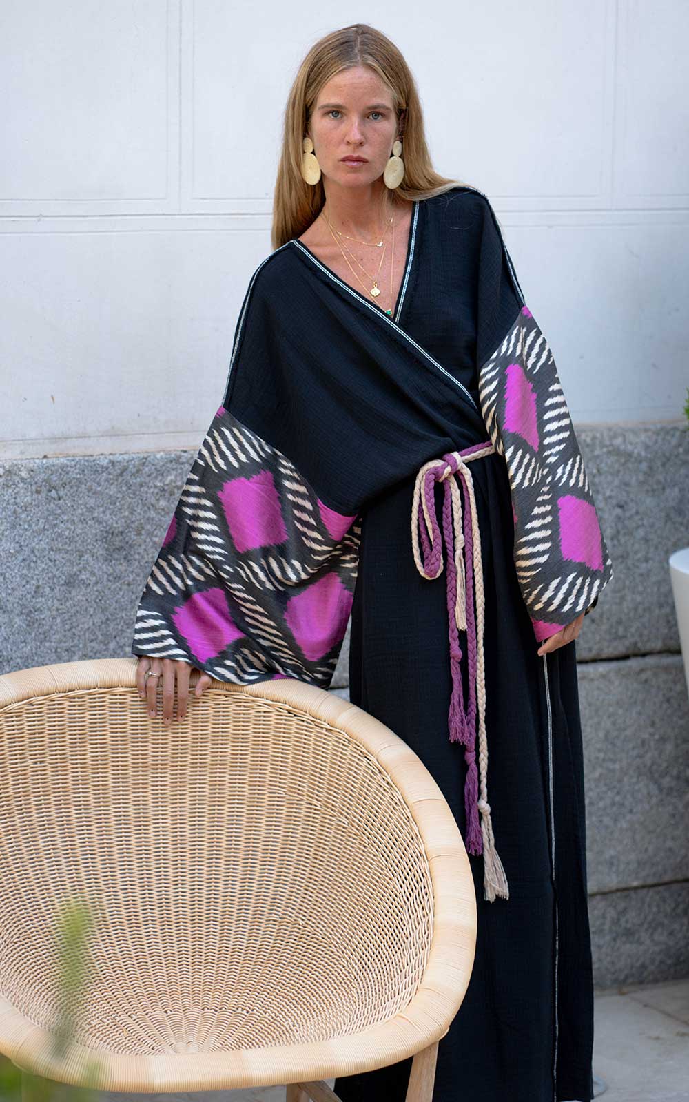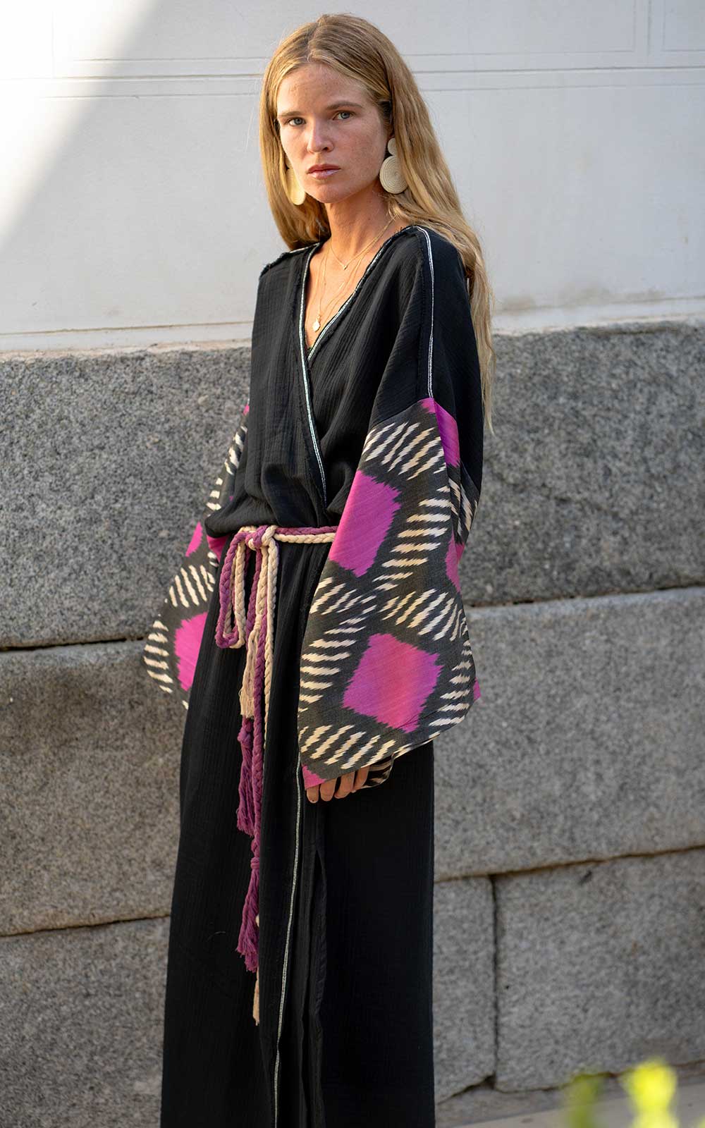 Vestido abierto de algodón con mangas y espalda de seda ikat. Se puede llevar tanto abierto como un kaftan o cerrado como vestido al disponer de dos cordones de algodón grueso.Ideales para los eventos de este verano