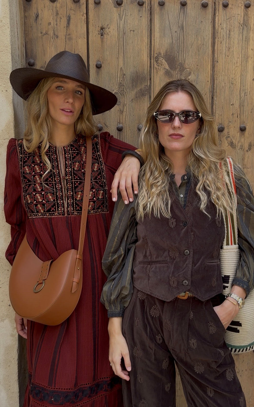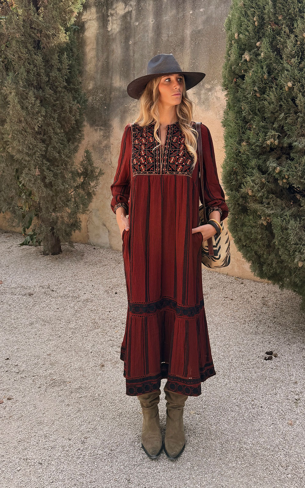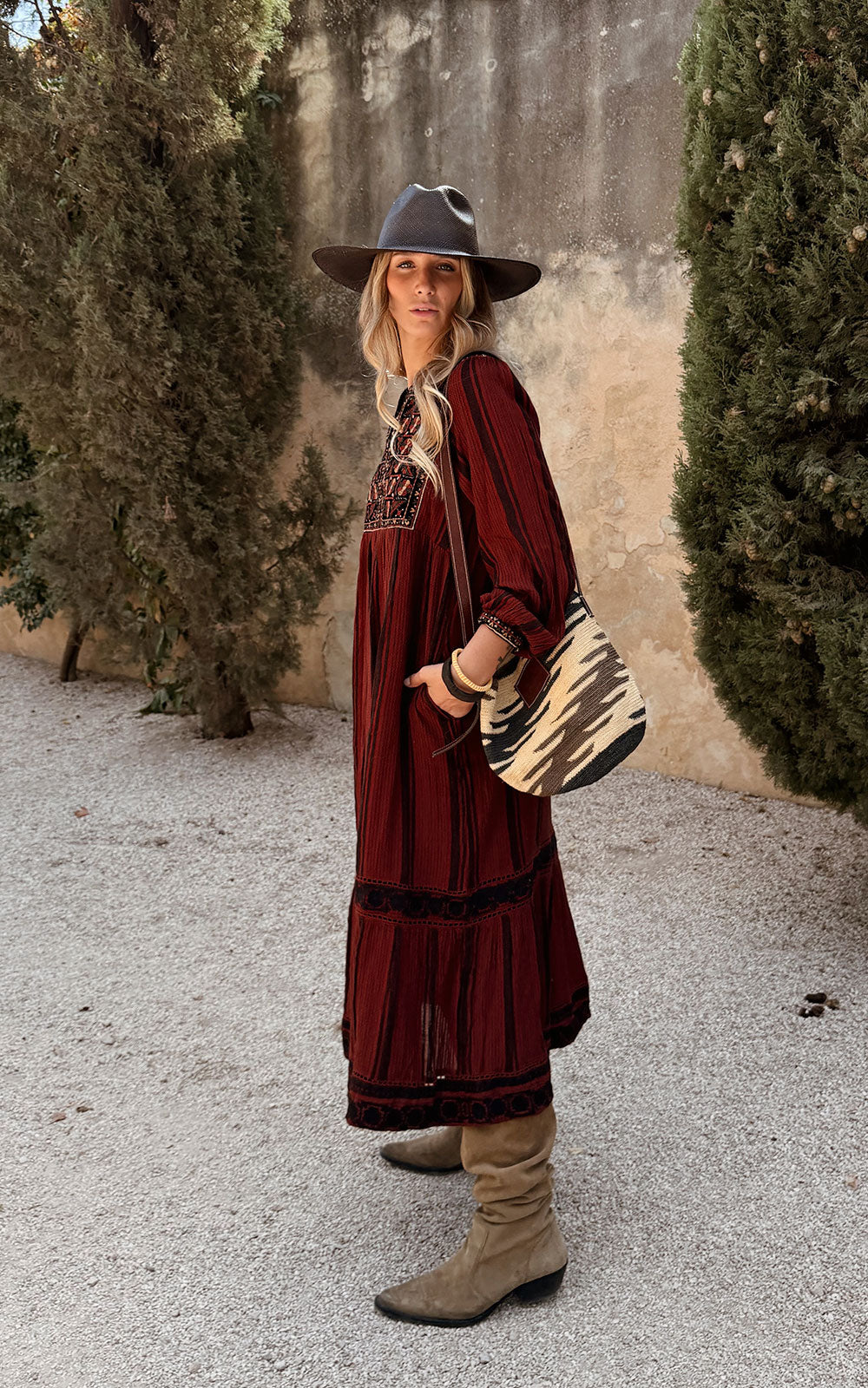 El pecho está enmarcado por paneles bordados a mano en rojo, negro y dorado. Su geometría folk, densa y precisa, recuerda a antiguos talismanes protectores, creando una presencia poderosa y femenina. El corte es recto, suelto y generoso; las mangas, amplias; y el escote, abierto pero equilibrado por el peso del bordado.